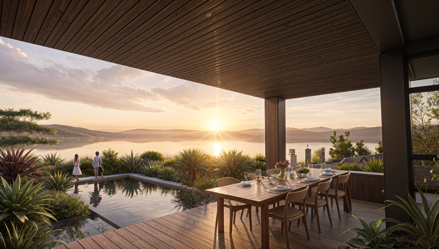 maintain colors stronger sunset not tropical water background add people hazy sky