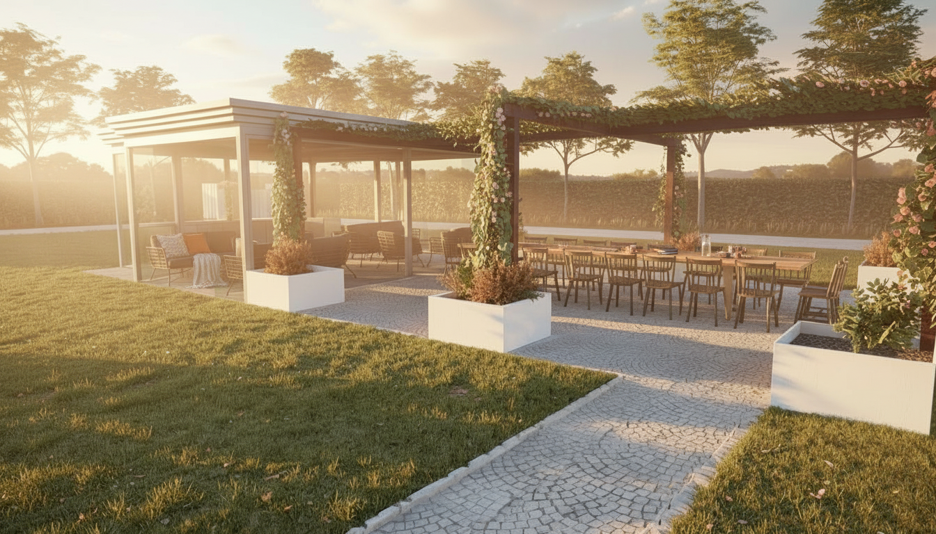zaha hadid exterior shot enhance the realism and atmosphere of this outdoor scene by adding defined volumetric light through the pergola softening the shadows on the ground and detailing the materials add micro imperfections and scratches to the wooden table increase the roughness of the concrete planters and the chromatic variety of the foliage also add some life details on the table and cushions in the sofa area architecture