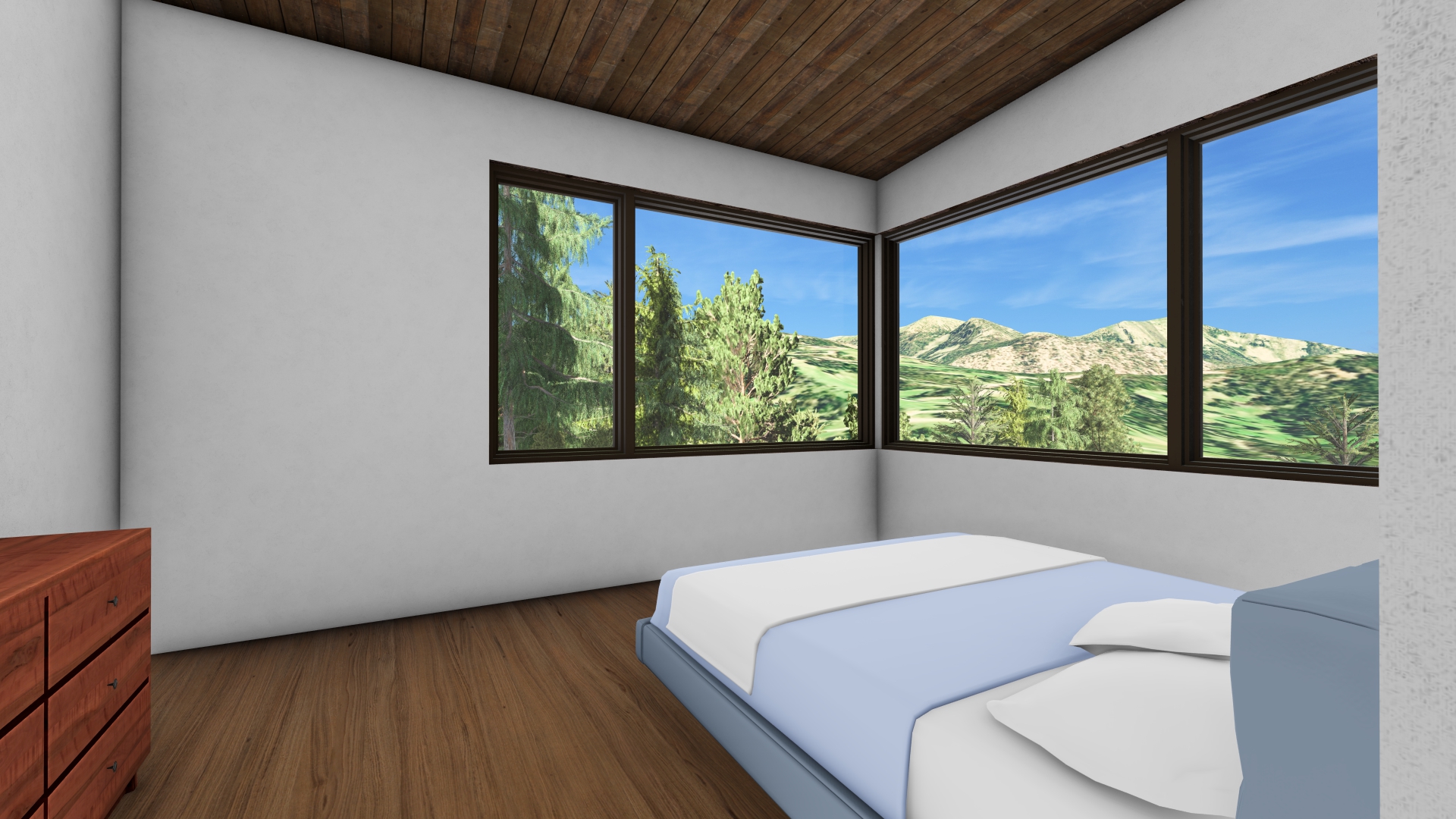 interior render light wood floors white walls wood t g ceiling make the existing exterior landscape snowy