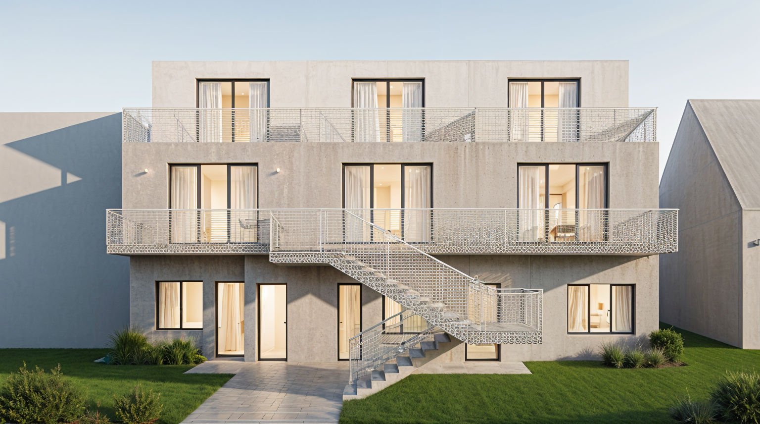 add a bit of pavement infront and road add soft light into windows and add white curtains into windows from interiror beige fasade more beige and rough plaster more pavement around the house upper floor more white