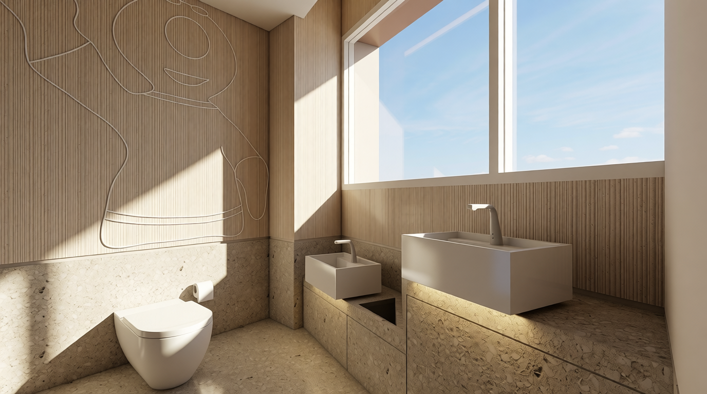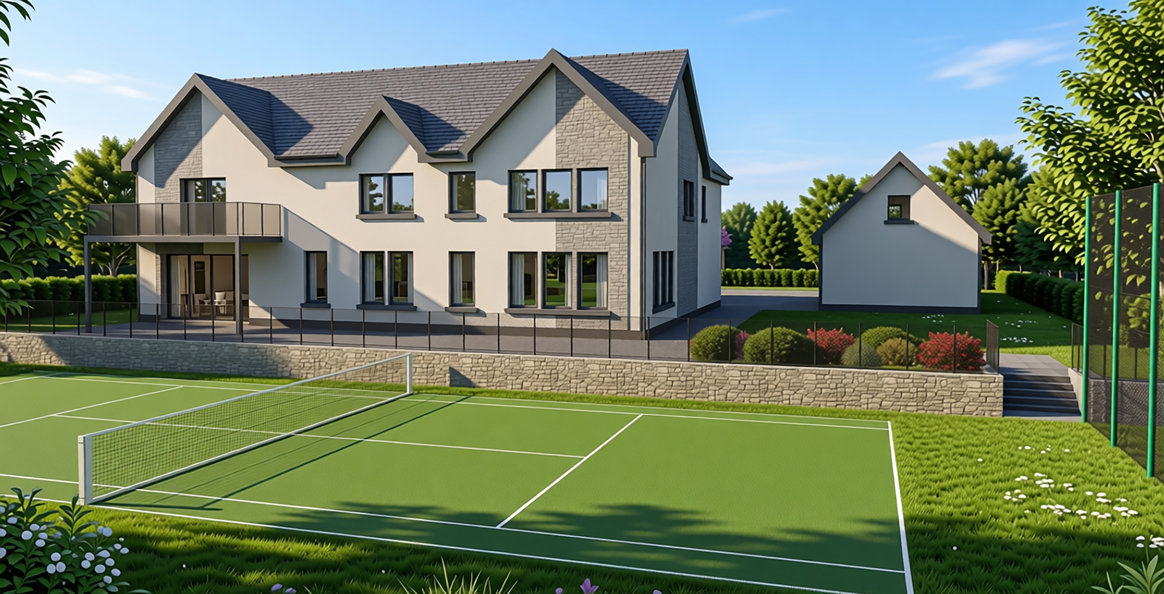 replace only the existing grass areas out with the tennis courts with a light concrete maintain the exact same camera angle perspective scale lighting shadows materials building geometry sky trees surroundings and overall composition the house fa ade windows roof landscaping elements and background must remain completely unchanged the new ground surface should follow the same contours and boundaries as the original grass with realistic texture scale and subtle surface variation appropriate for architectural visualization no new elements added no elements removed no style changes photorealistic result