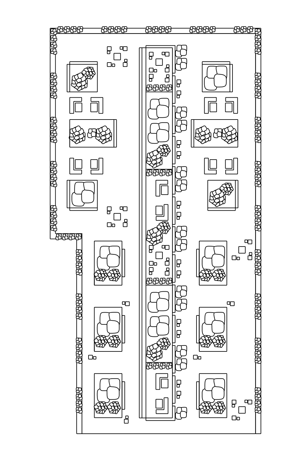 convert this floor plan into a realistic isometric 3d view of a full house show the space from an elevated angle with furniture walls and details visible create a outdoor garden space with cube shaped foliage and outdoor furniture the whole space lined with cube shaped bushes scattered around the edges of the furniture are tall colored glass panels that project color around the space use the same furniture as shows on the plan do not change the orientation of the floorplan