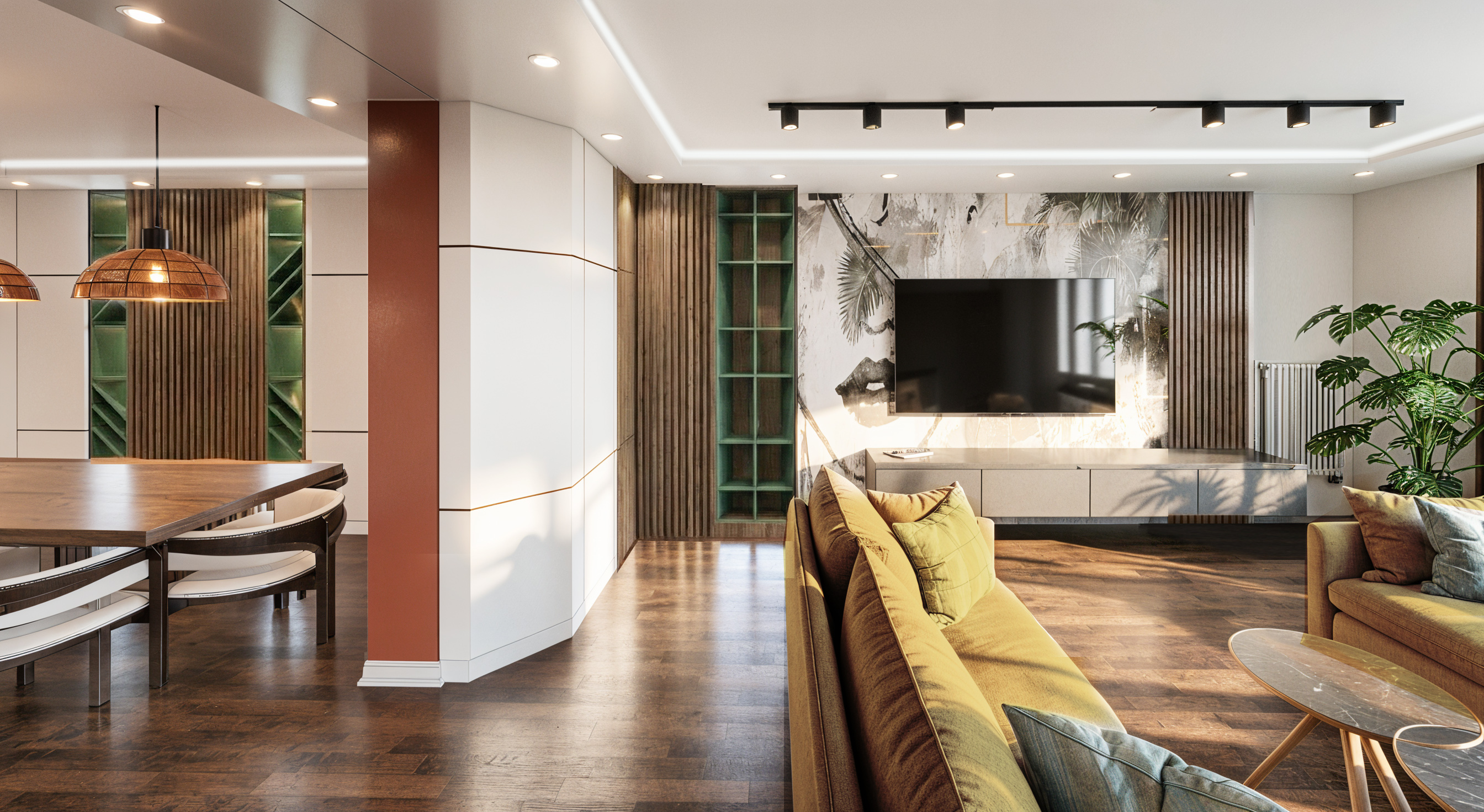 do not change anything only change the living room table so that instead of white marble it has black marble put books on the shelve in the center and bottles in the shelves on the left do not change the shape of the shelves