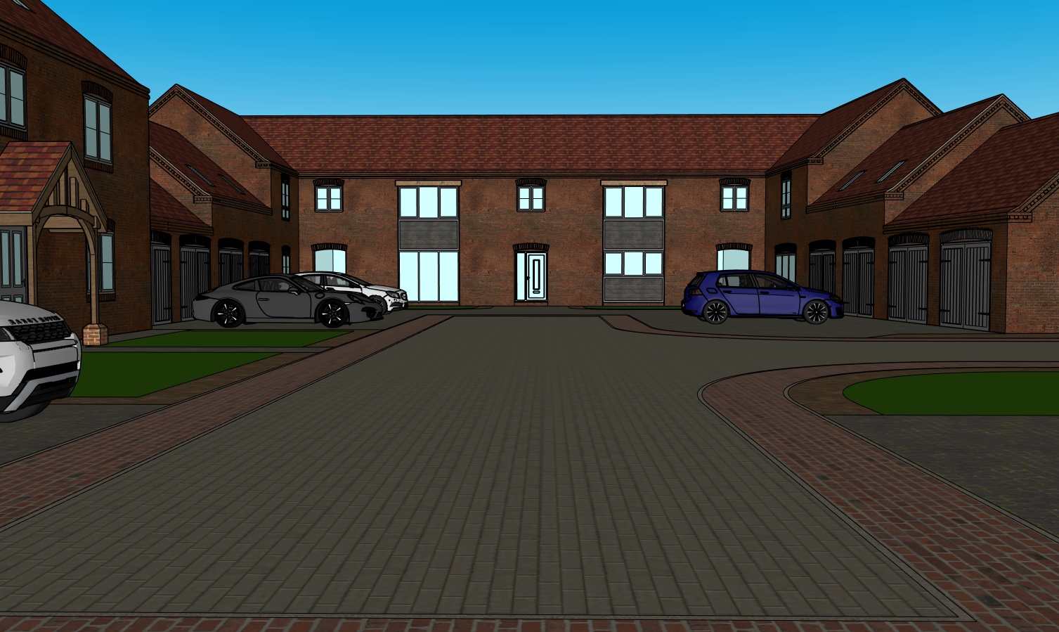 light cloudy sky red brown pan roof tiles light grey windows and doors summer golden hour landscaping to edge of grass