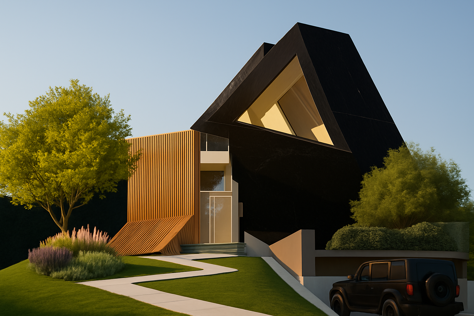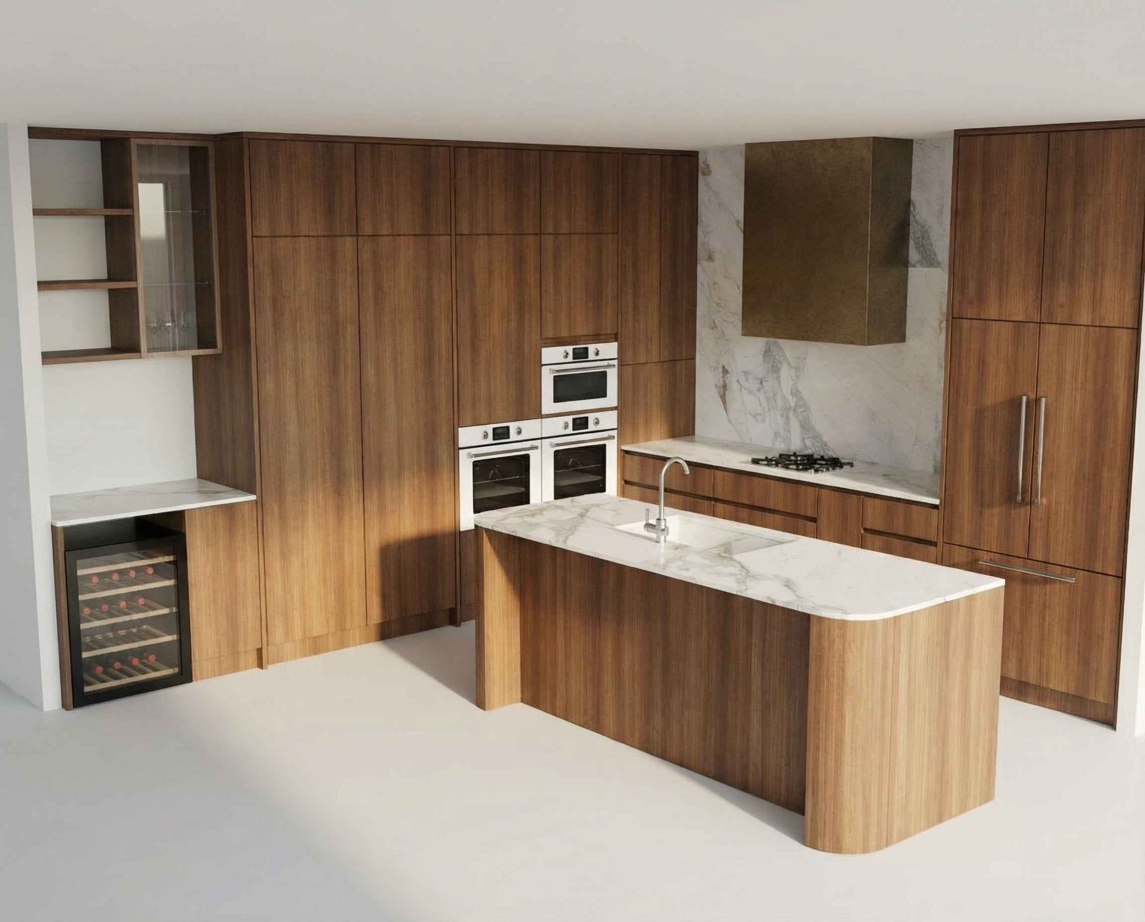 dark timber cabinetry light oak floor black appliances