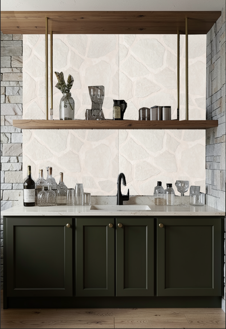 can you render this with the stone i photoshopped in make the shelf about 8 deep and have down lighting from the shelf get rid of the top piece of wood on the ceiling and just have the shelf bars applied to the ceiling
