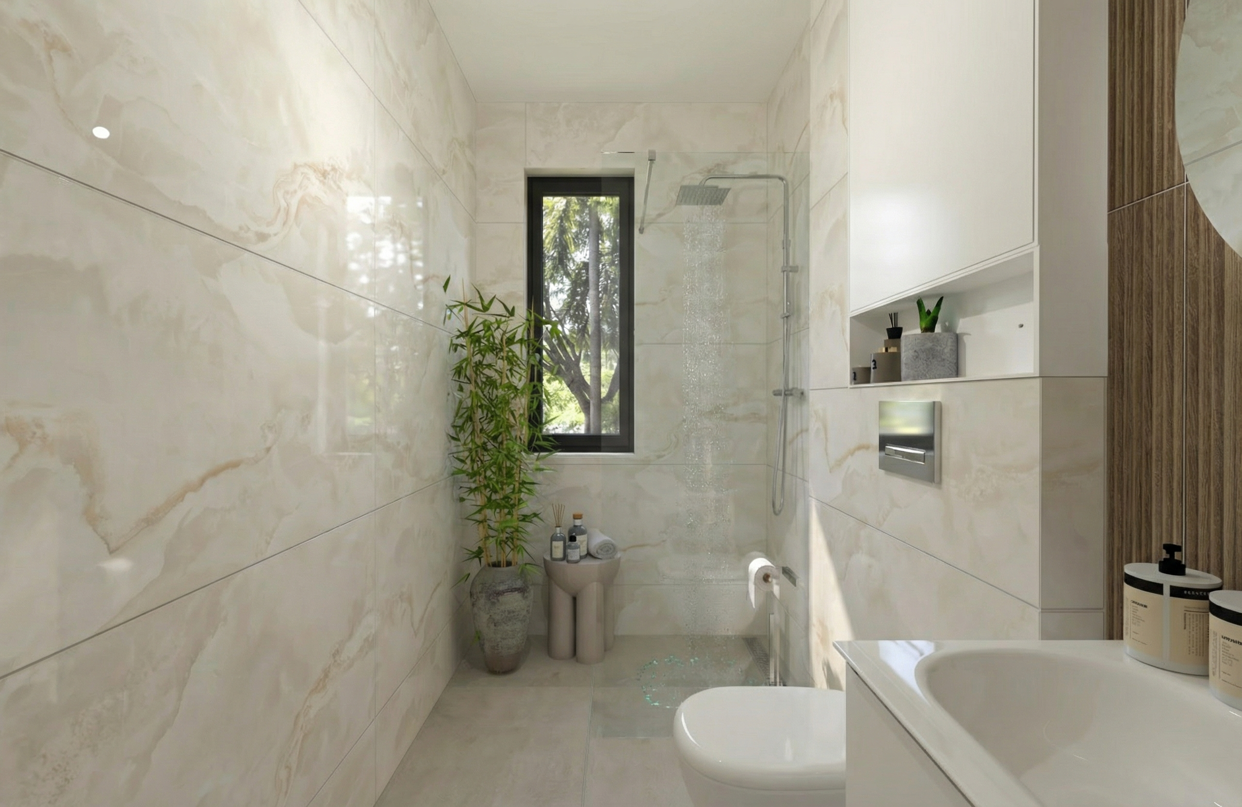 lot of reflects and sun light the sun illuminates the facade that we see some trees in the background facade more in the light more reflect all is painted no stone the fence call is beige like the extension more shadows of trees on the facade my point of view the attic floor on the left is dark terracotta more lighter the right part of the house is white the fence is the same color as the left part of the house
