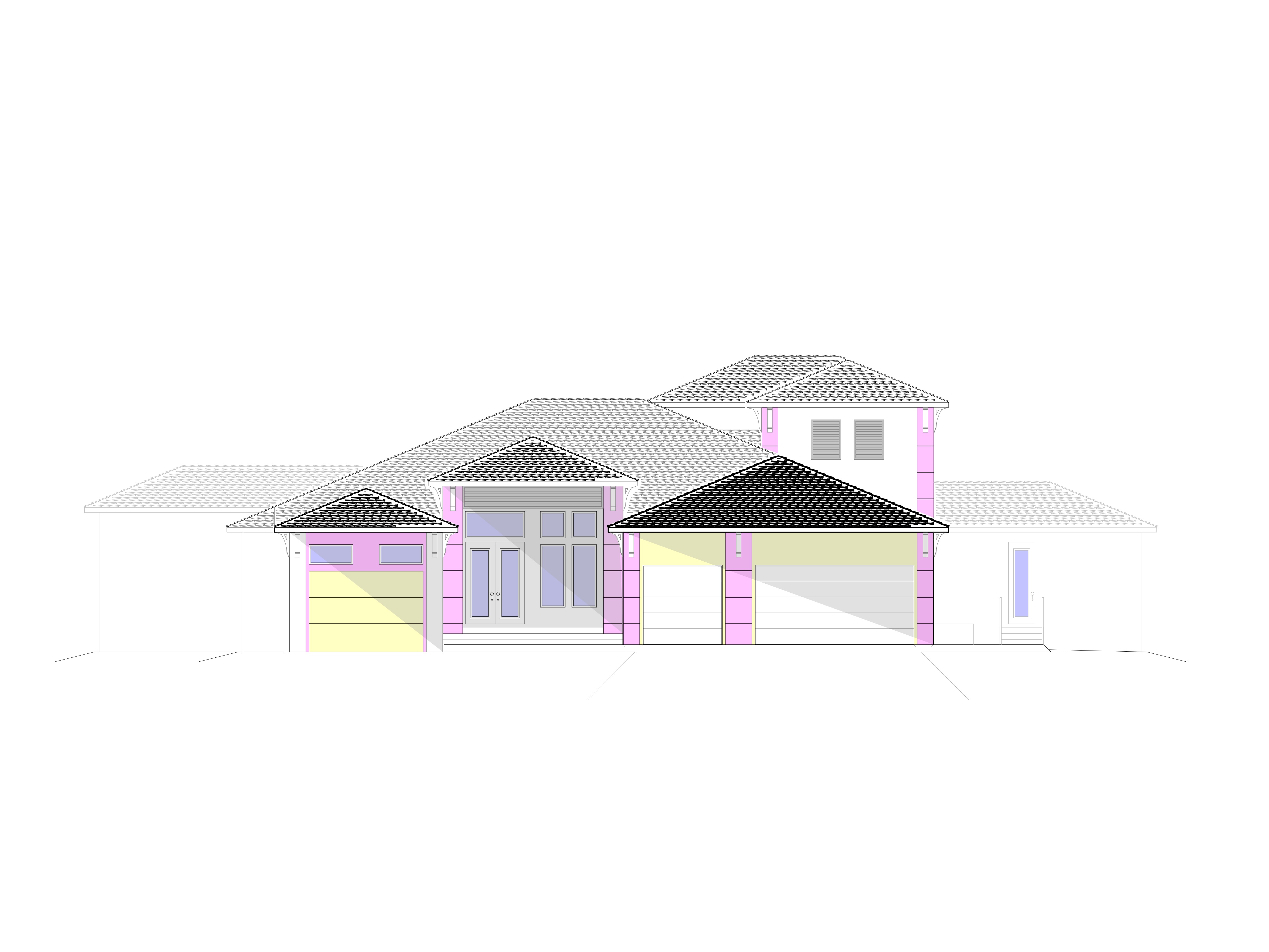 dark gray flat tile roof dark gray soffit and fascia white window frames white walls dark gray soffit corbels dark gray garage doors to the right of the entry dark gray entry door dark gray bahama shutter above the entry door dappled gray paver driveway to the edge of the road grass yard tropical landscape garage doors on right side of the entry are both 12 in front of the entry 3 4 wide space between them with single hipped roof line above roofed area to the left of the entry is 8 in front of entry columns with 4 6 wide x 2 0 high transom windows 2nd floor area above the garage to have dark gray bahama shutters mounted flat to the wall yellow color to be dark gray accent banding magenta color to be light gray accent banding light blue color depicts window