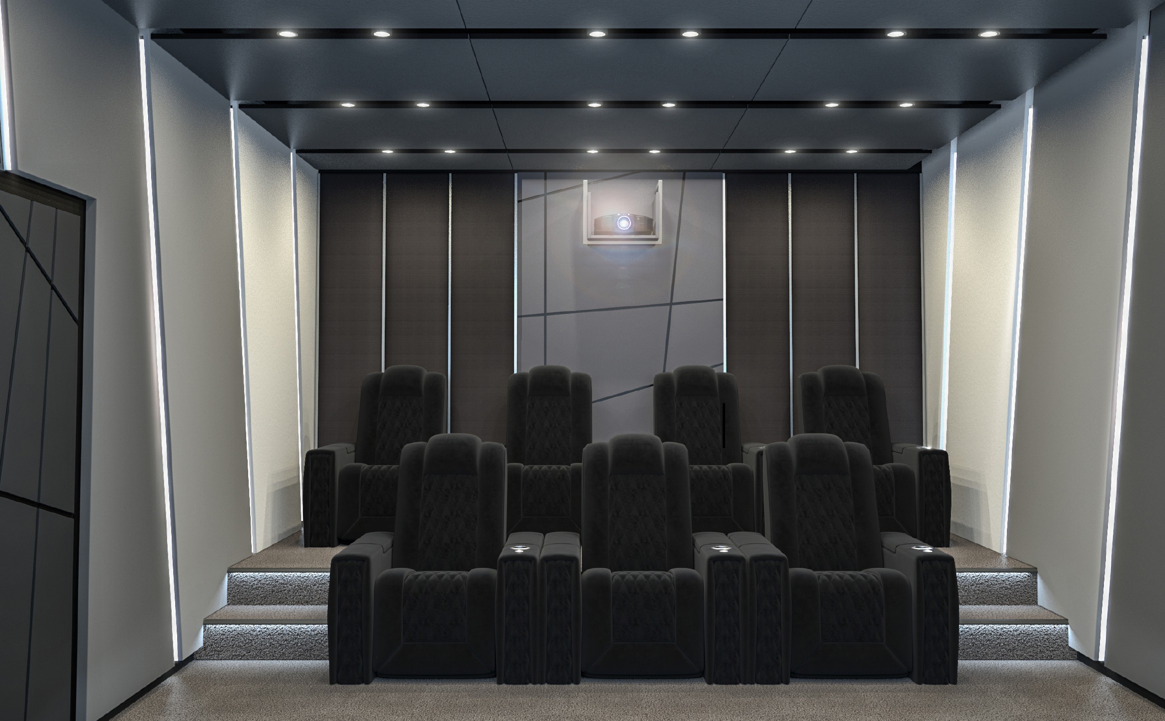 render a modern home theater with sleek contemporary design the walls are a gradient of soft neutral grays and whites creating an elegant and calming atmosphere the large projection screen displays vibrant colorful thumbnails of movies adding a dynamic visual interest the theater seats are plush and charcoal gray offering a comfortable and luxurious feel ceiling lights are recessed casting a warm ambient glow the carpet is a subtle light gray adding a touch of sophistication overall the atmosphere is cozy and inviting perfect for an immersive movie experience