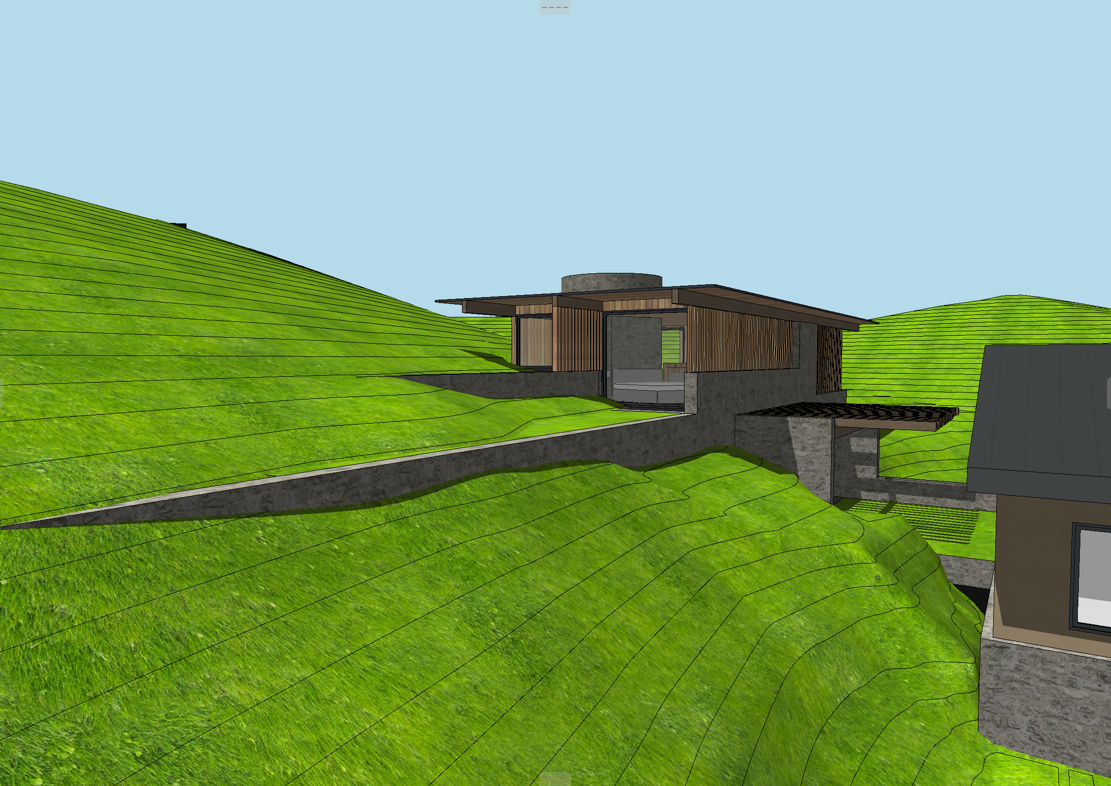 landscape hillside with sagebrush and tall wild grasses brown drystack stone walls light coming through the vertical wood louvers add a person walking under the pergola on the lower level