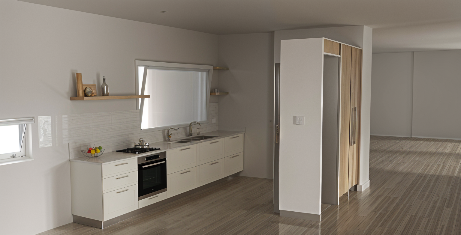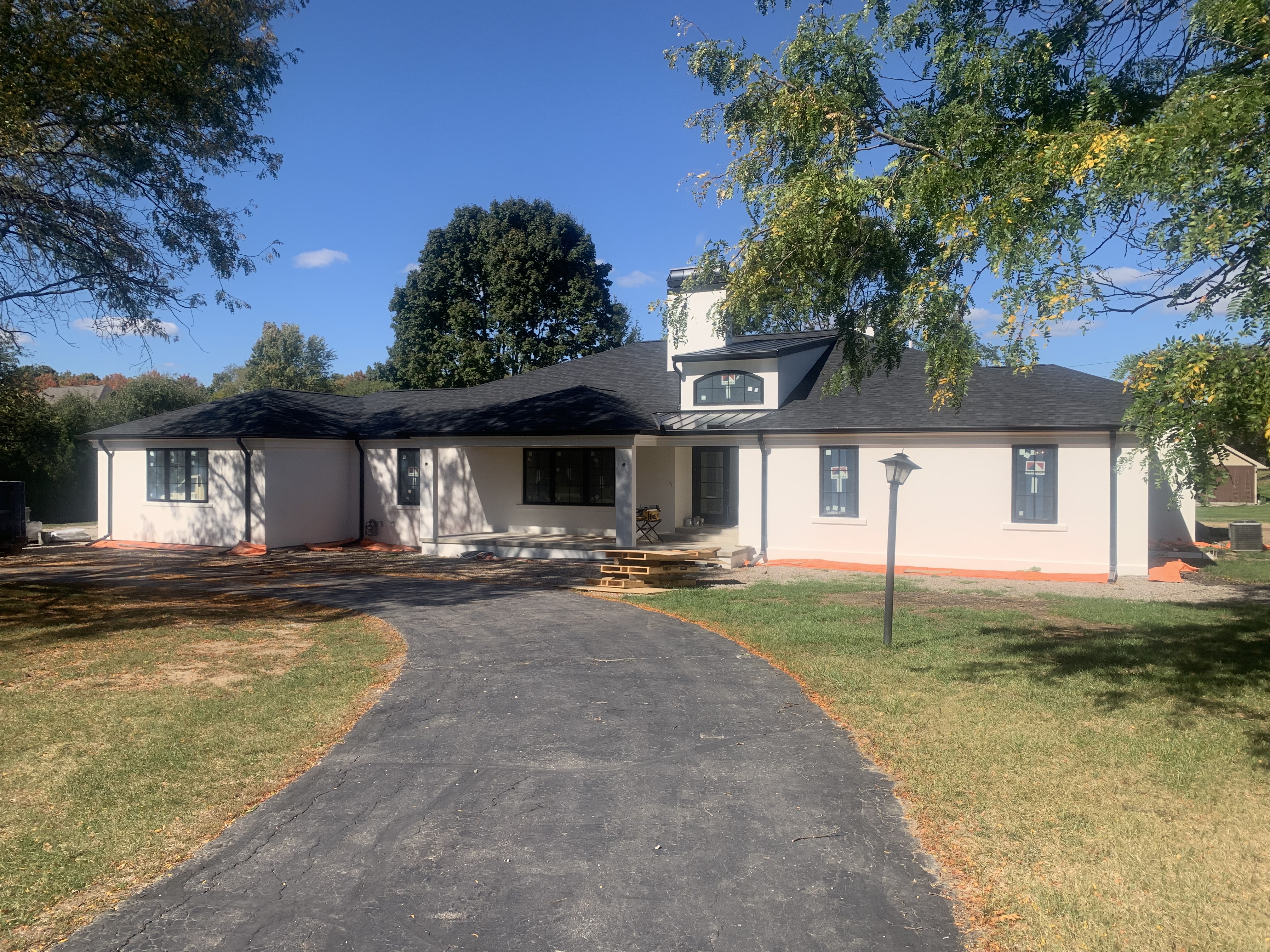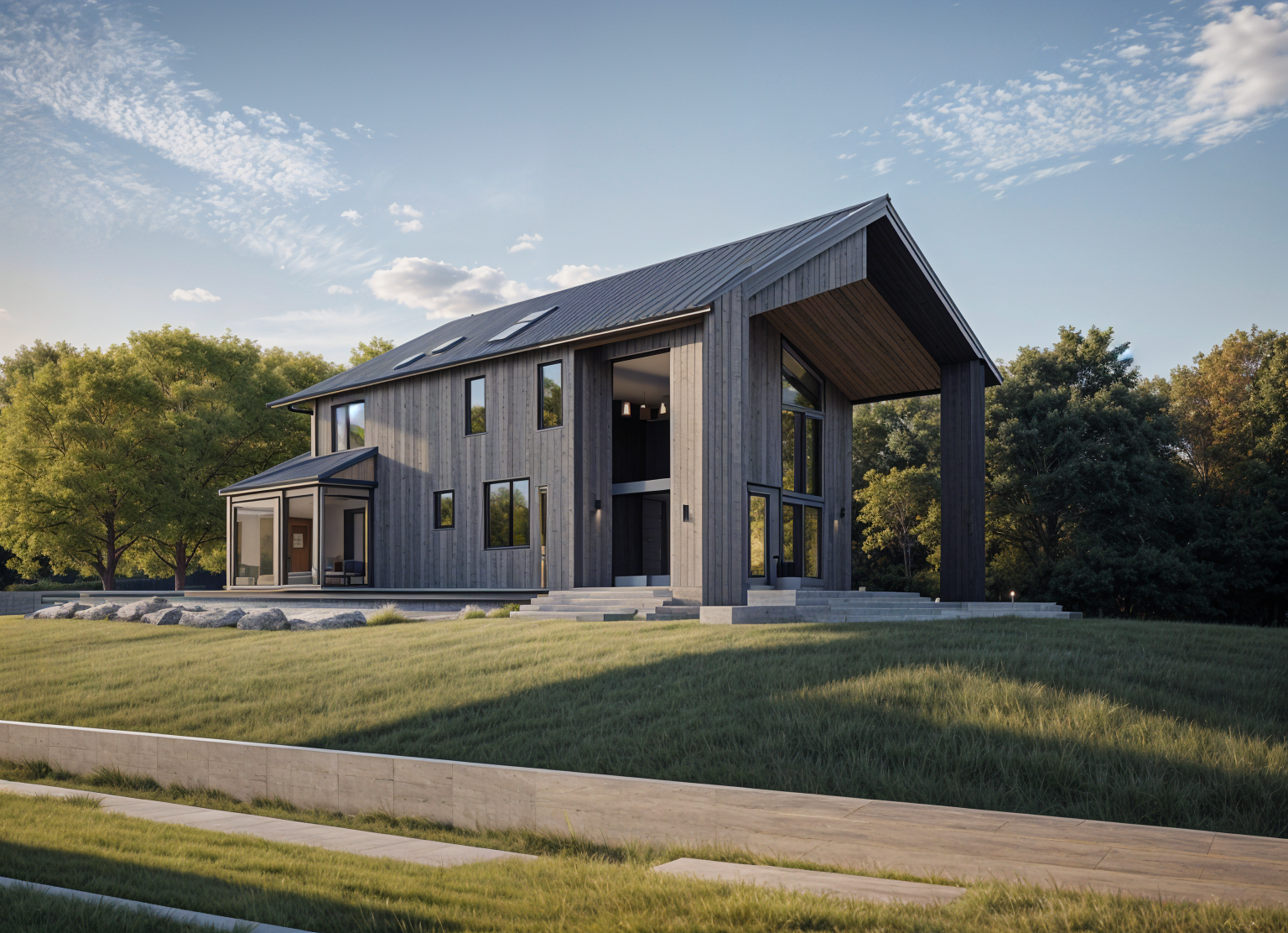 render outside in off white synthetic plaster material black aluminum window dark charcoal shingle roofing grass in foreground architecture