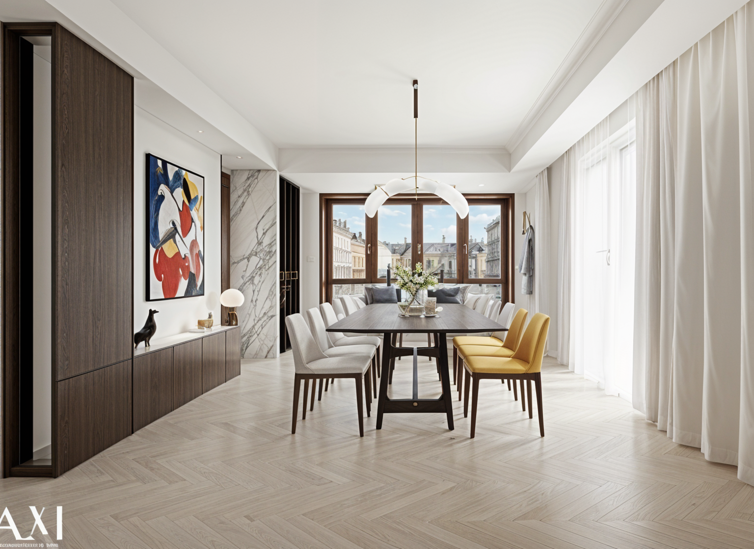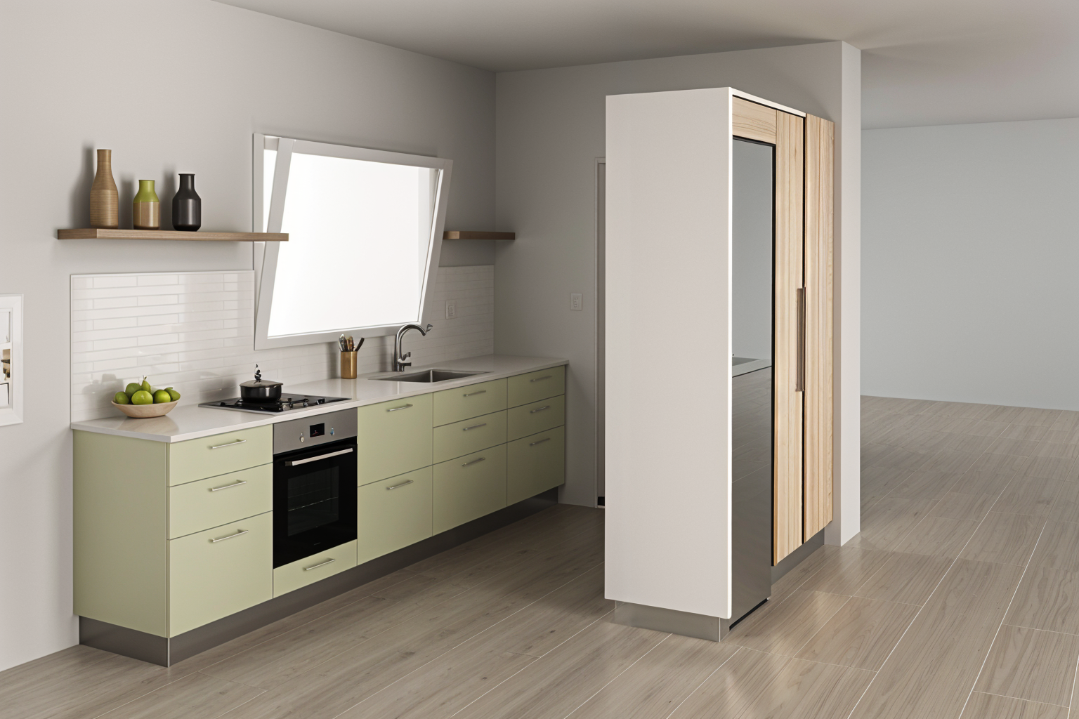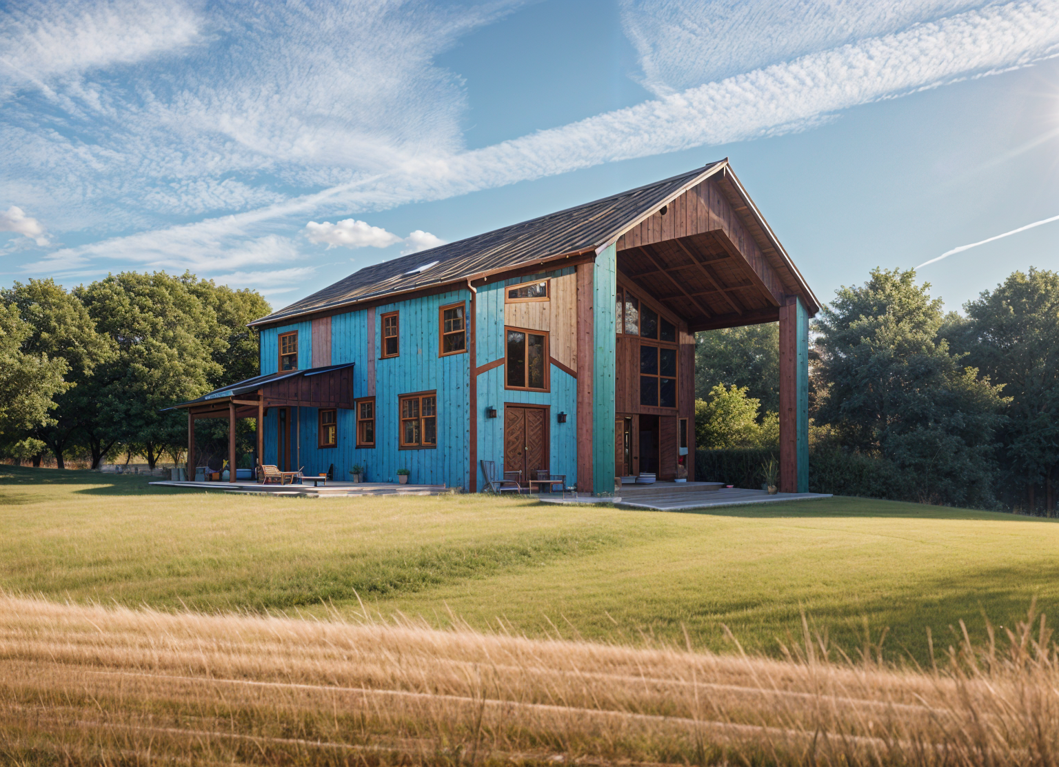 render outside in off white synthetic plaster material black aluminum window dark charcoal shingle roofing grass in foreground architecture