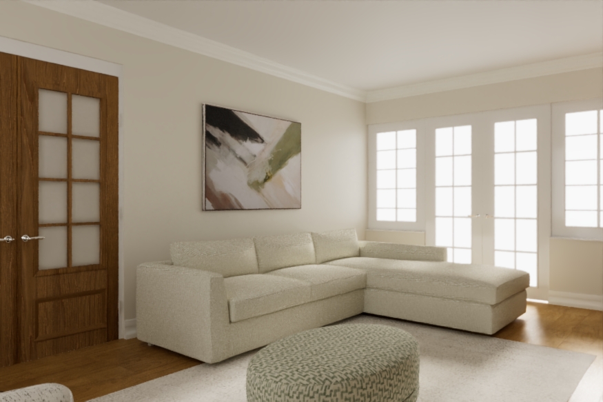 improve the lighting and quality add cushions on the sofa 2 either side one in the green the same green as artwork and one in neutral colour add a background outside some kind of garden sunny weather