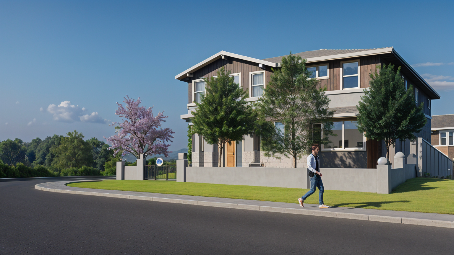 photorealistic rendering of suburban homes on a gently sloping hill during a bright sunny day the houses feature beige stucco walls vertical siding on the second floors stone at the base and gray shingle roofs reflecting warm inviting tones the grass on the hill is lush and vibrant green the sky is a clear azure blue with scattered fluffy white clouds the background shows a line of dense dark green trees creating a serene and peaceful atmosphere the sun casts soft natural shadows enhancing the overall warmth and tranquility of the scene architecture