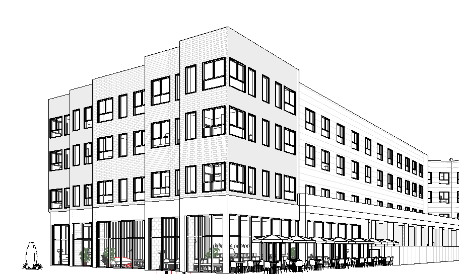 realistic building with iron spot brick and a lively restaurant ambiance on the first floor