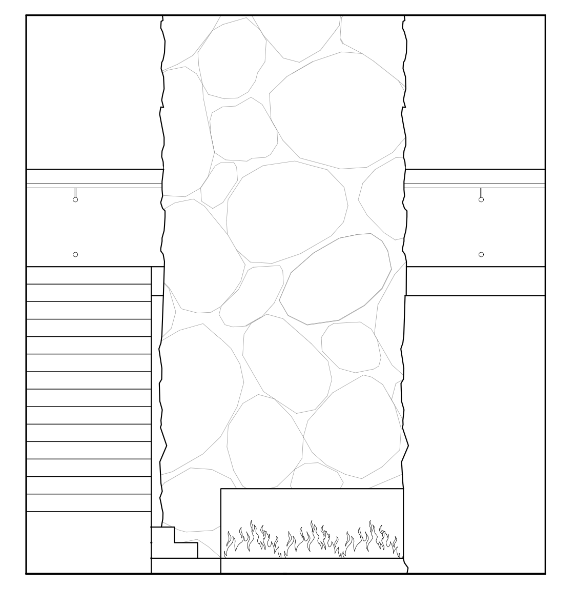 generate an 3d rendering of this elevation based on the attached floor plan including notes show the fireplace feature as image attached add rick owens bench as image but in driftwood finish and limestone coloured suede ceilings are light wood coffered with sky lights in four centre panels floor pattern will match the coffering pattern in wood inset with limestone large pavers stair will be open tread similar to shared image with glass railing all continuing to bridge across elevation at top add an aged brass and leather handrail at approximately 34 above each tread fixed to the glass panel