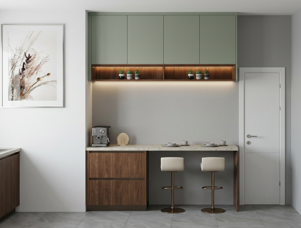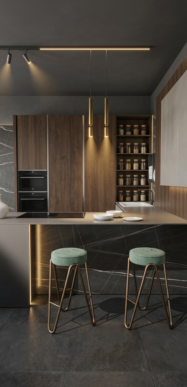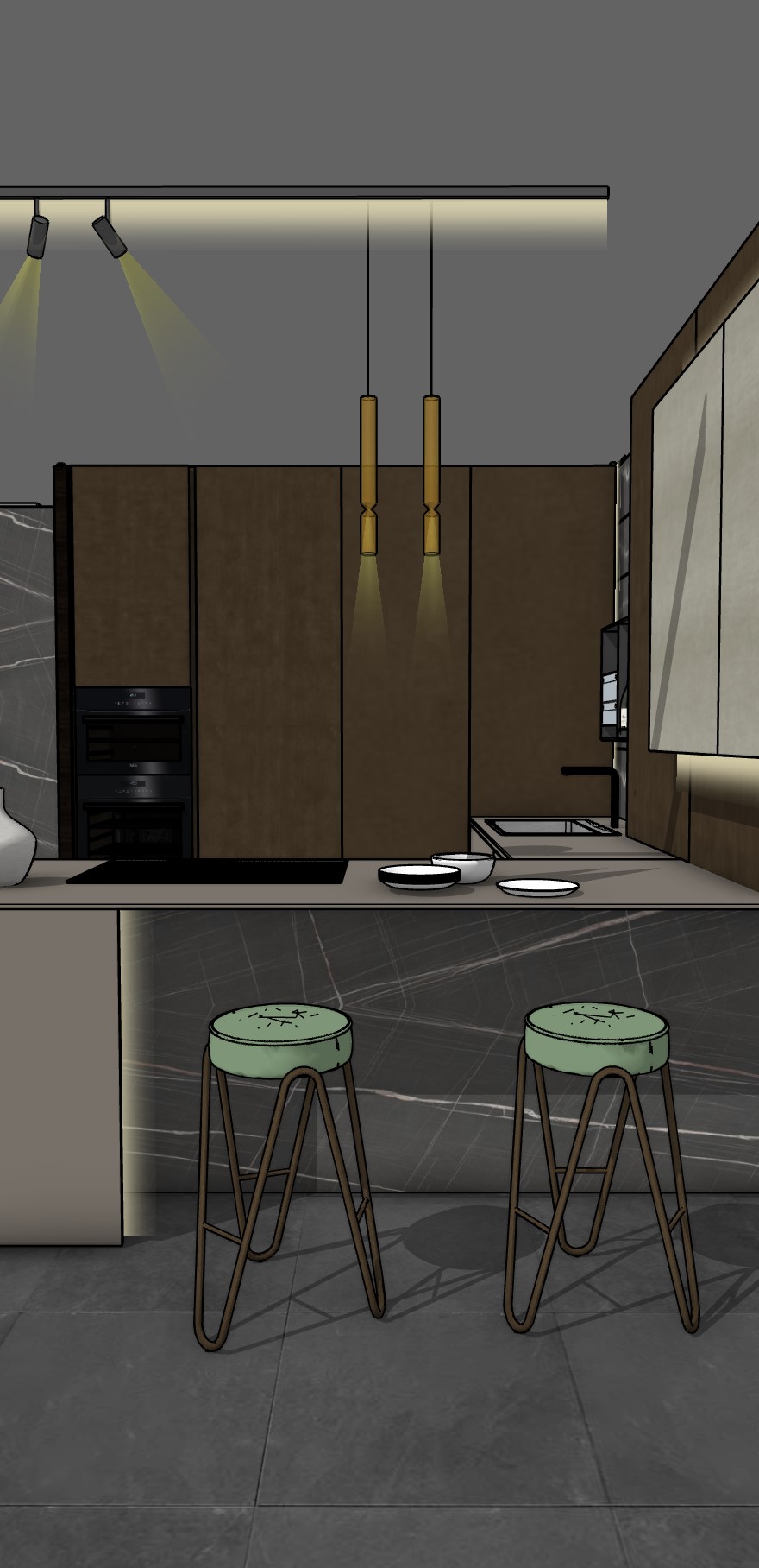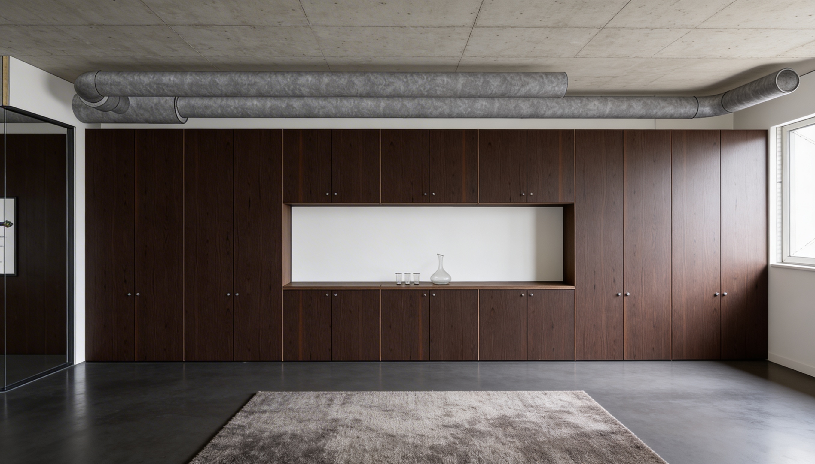 columns are dark corten ont the right there are silver cabinets