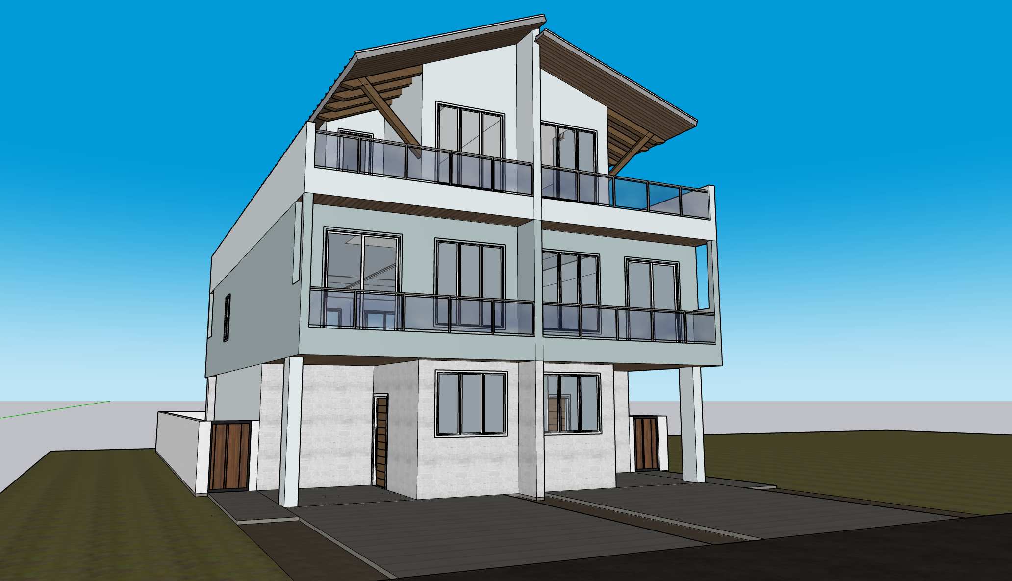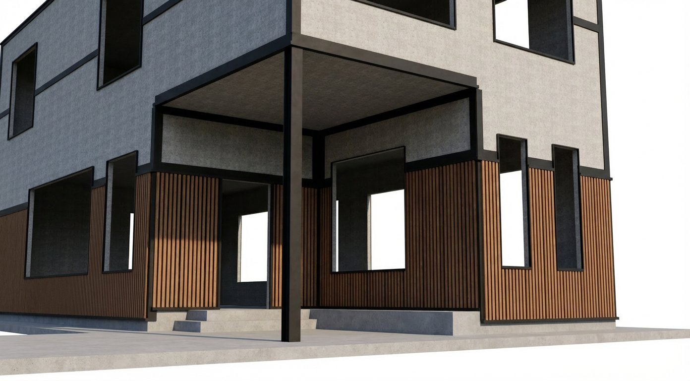 modern exterior shot render the uploaded image as a final high quality architectural visualization while maintaining consistent style lighting and materials create a photorealistic high end architectural rendering of a modern beach townhouse the property is located in a coastal neighborhood surrounded by similar beach homes so ensure the surrounding context includes neighboring houses with cohesive coastal architectural styles colors and materials the beach is located on the left side of the property while it is not fully visible include a subtle but realistic glimpse of the beach and ocean in the background on the left side with appropriate lighting and atmospheric depth use a luxury coastal aesthetic preserve and accurately enhance all materials exactly as assigned in the provided image do not change replace or reinterpret materials colors or finishes only improve realism through lighting texture refinement reflections and shading environment and realism add subtle landscaping such as coastal plants palm trees and dune grass include realistic shadows reflections and ambient occlusion midday or late afternoon lighting with soft coastal sunlight slight ocean haze for depth rendering quality ultra realistic high resolution physically accurate lighting and materials sharp but natural contrast not over processed camera perspective slightly wide angle but not distorted ensure the render feels polished and presentation ready avoid cartoon style overly saturated colors unrealistic textures distorted geometry warped windows or doors excessive blur low detail and exaggerated lighting architecture