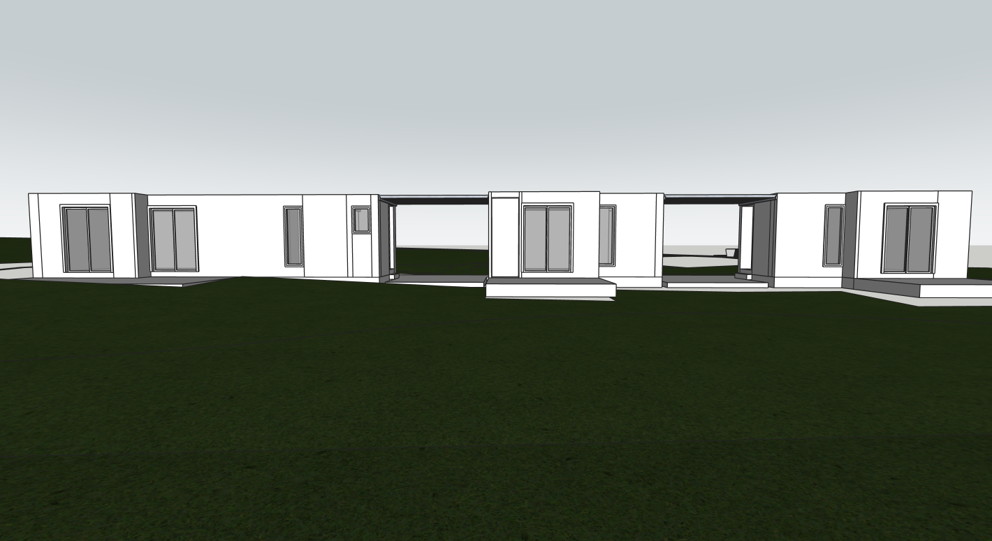 modernist exterior shot it is a modular house with three parts connected with porches between each module facade is vertical striped prefabricated panels cladding 5cm aluminum black color material is quadroline by hunter douglas in the left module and in the right module vertical 1m width fiber cement prefabricated boards cement color viroc cement board panels this houses are mostly used in outdoors like woods please use a backround accordingly sunny day and a beautiful green grass all over the place and in front of the left module and in the floor a deck without furniture in the deck show a living room in the inside not use what original model has inside use blured window in the narrow window there is only one narrow windowthe floor ouside the homes is onluy green grass architecture architecture