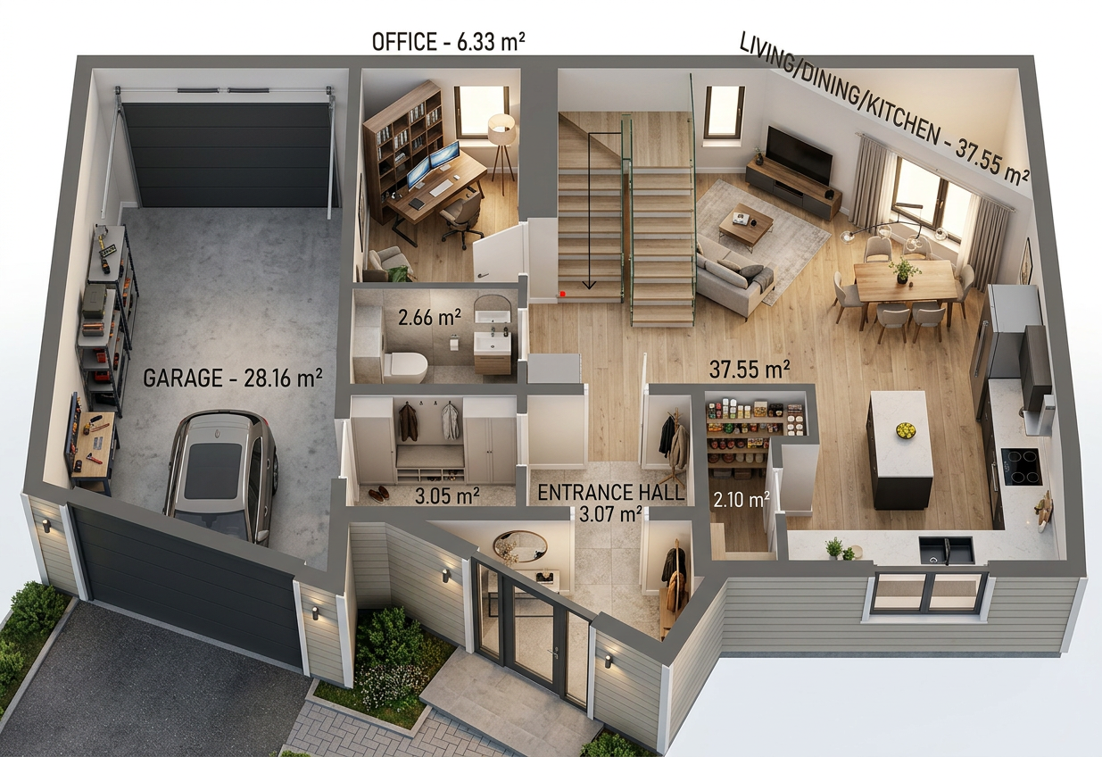 you are a professional image renderer you create the highest grade renderings around and specialize in architectural renderings this is the floor plan of a house create a high resolution photorealistic image of this structure keep the windows as they are where they are keep the doors as they are where they are keep the main structure as it is where it is feel free to change the perspective do not add anything to the structure or furnishings that i have not asked for the surrounding site will be a luxury estate the landscaping should be late summer with plenty of color and should be that of a luxury estate