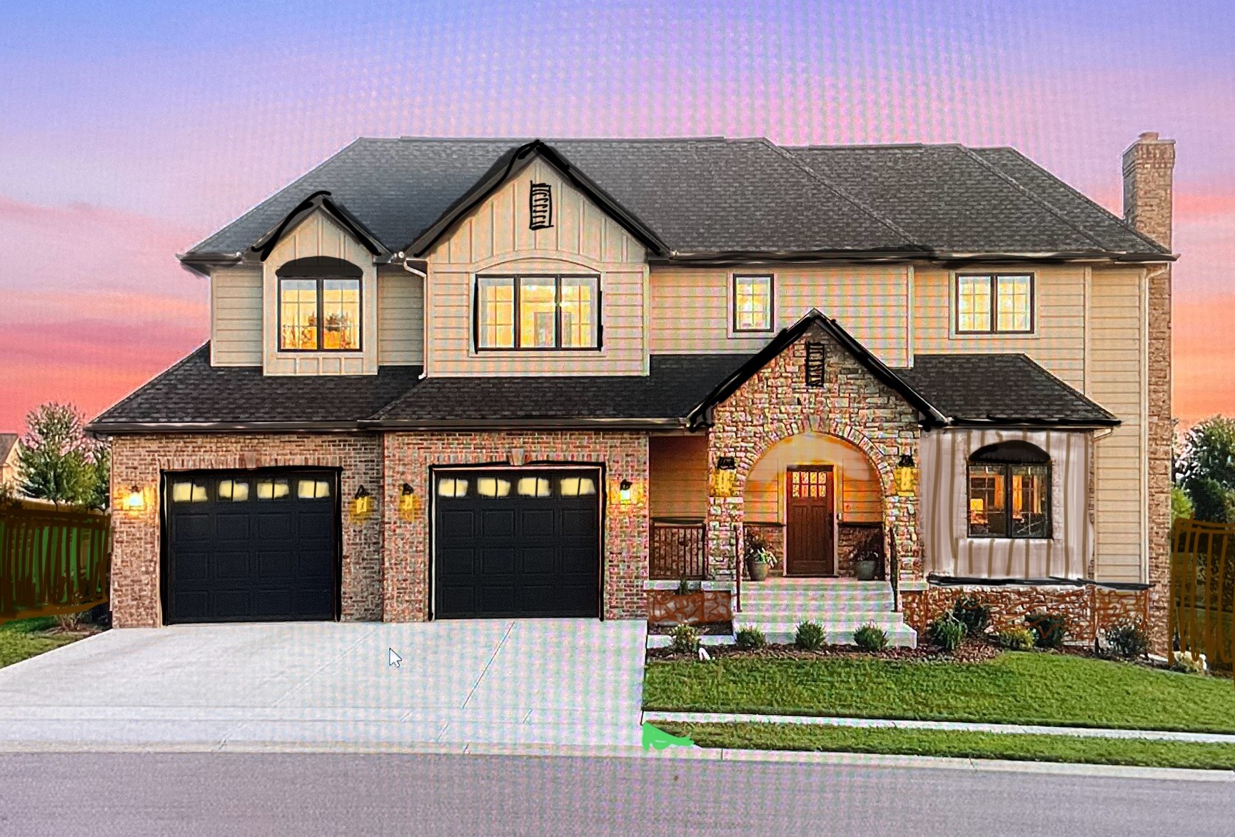 render a realistic photo of this exterior warm natural colour tones with a mix of stone and brick as shown