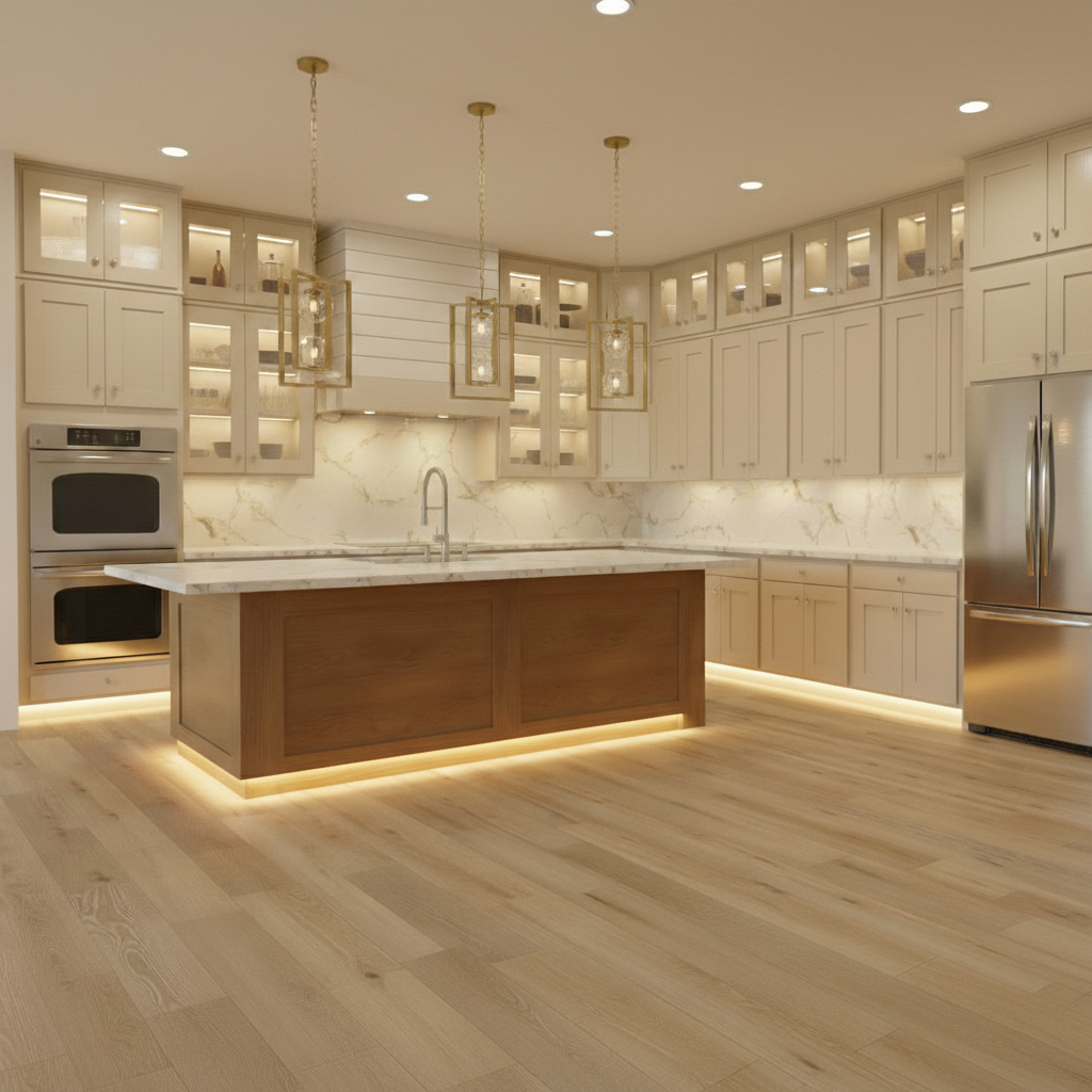 replace glass inserts with solid panels on the cabinets next to the range hood