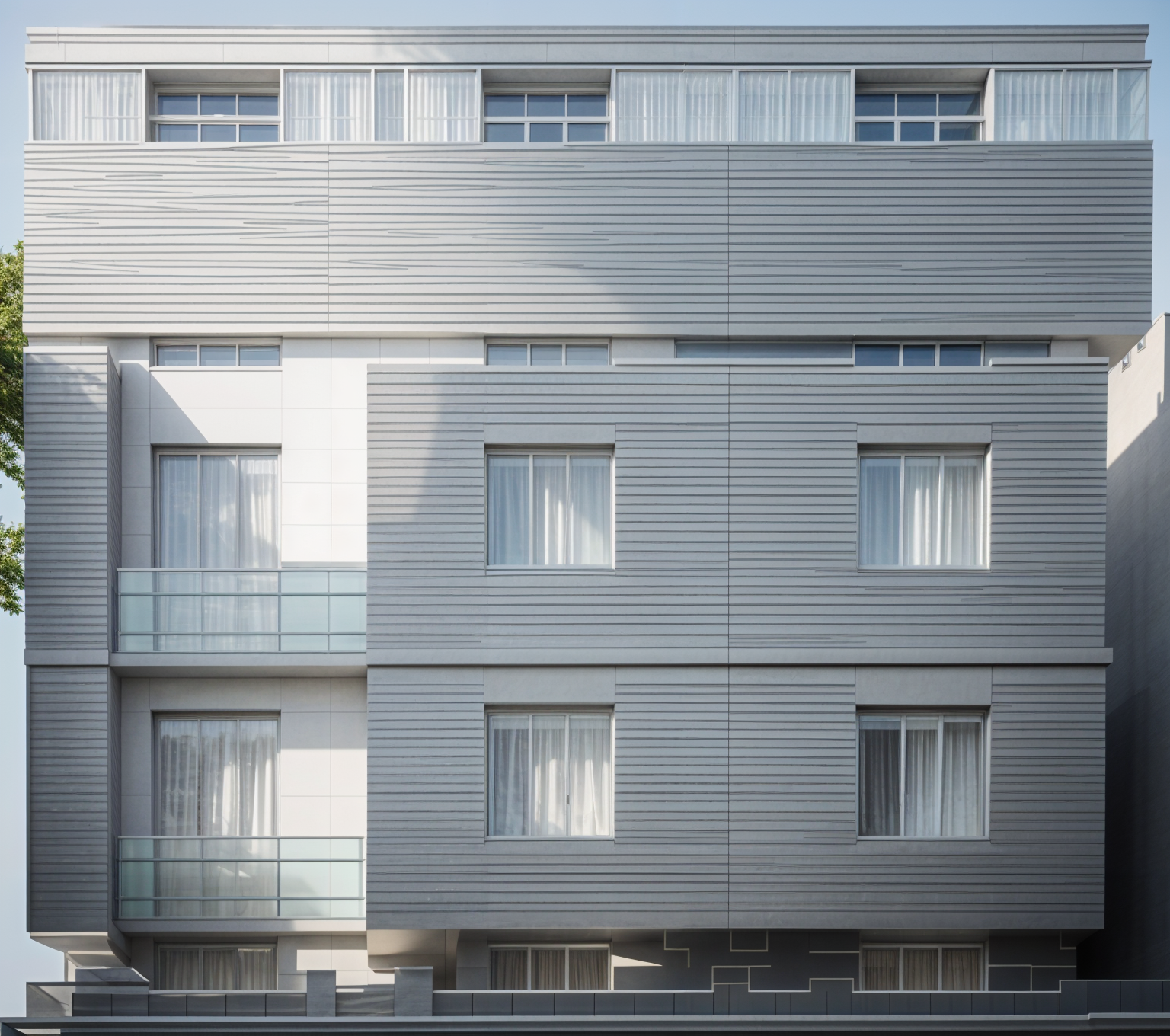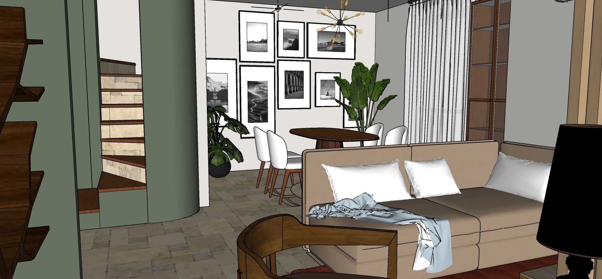 interior shot generate a modern living room interior scene with a cozy atmosphere include a tan colored sectional sofa with white pillows draped with a light blue throw a round wooden dining table is surrounded by sleek white chairs set against a backdrop of white walls adorned with black and white framed photographs introduce lush green plants in black pots for a touch of nature use wooden flooring and a spiral staircase with light beige steps and dark wood accents a soft neutral color palette with warm lighting emanates from a gold modern chandelier creating an inviting serene ambiance