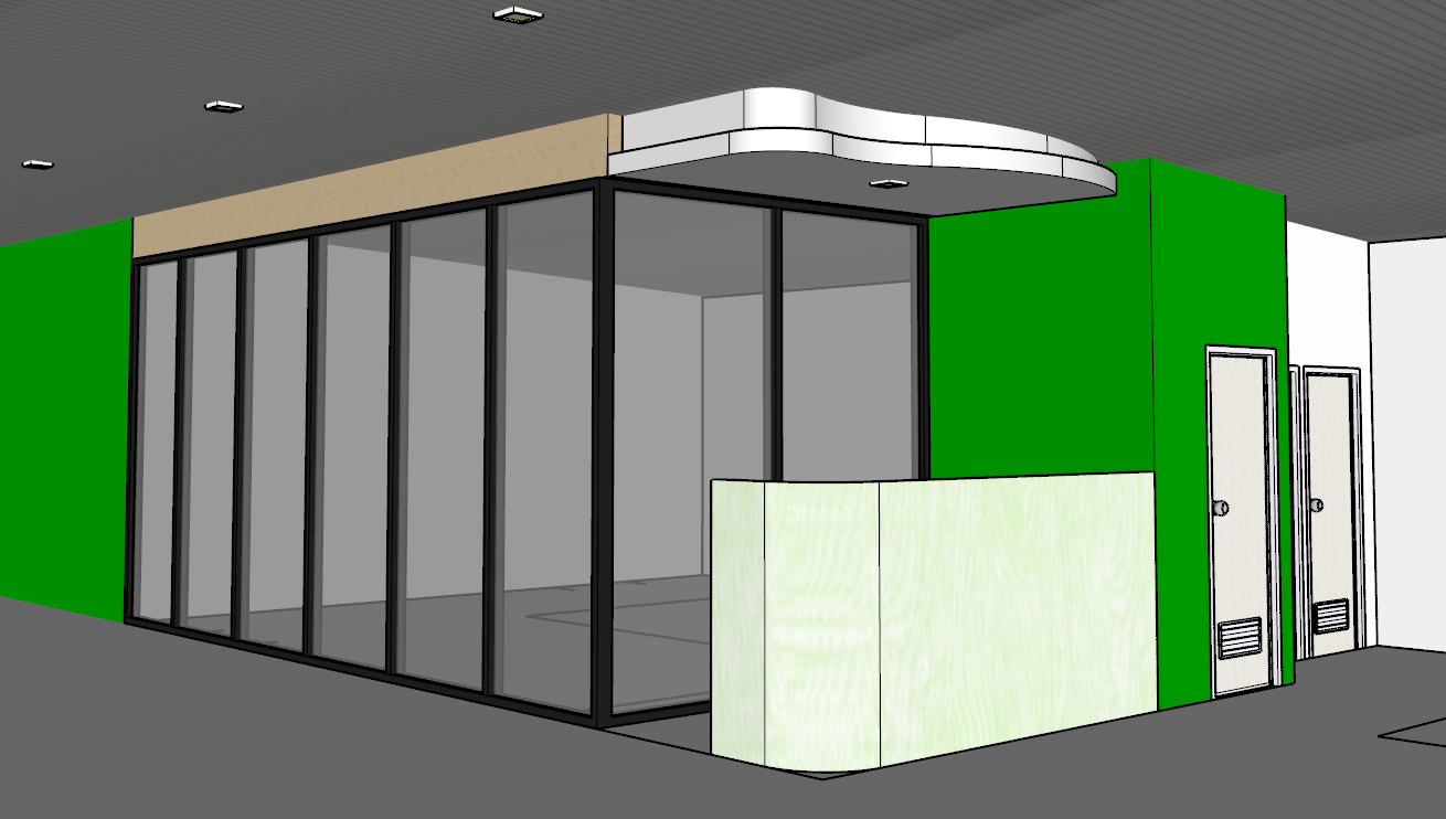 interior design modern cafe takeout area reception apple green color walls moroccan floor tiles full glass function room inside glass party area