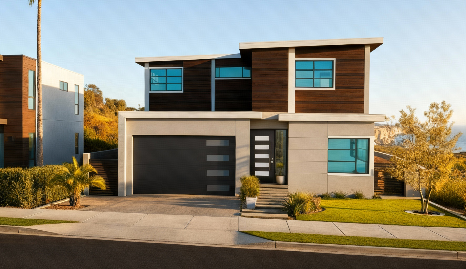 modern house with a sleek contemporary design the facade features top floor a rich matt dark brick solid color hardi panels with white trim and medium gray smooth hardi panel finish finish fisrt floor creating a striking contrast large windows with subtle blue reflections with furniture behind invite natural light the garage door is black with horizontal lines the roof is flat with clean white trims lush green grass surrounds the front with small shrubs and a palm tree adding a tropical feel the sky is a soft blue hinting at an early morning or late afternoon setting casting a warm and inviting glow over the entire scene