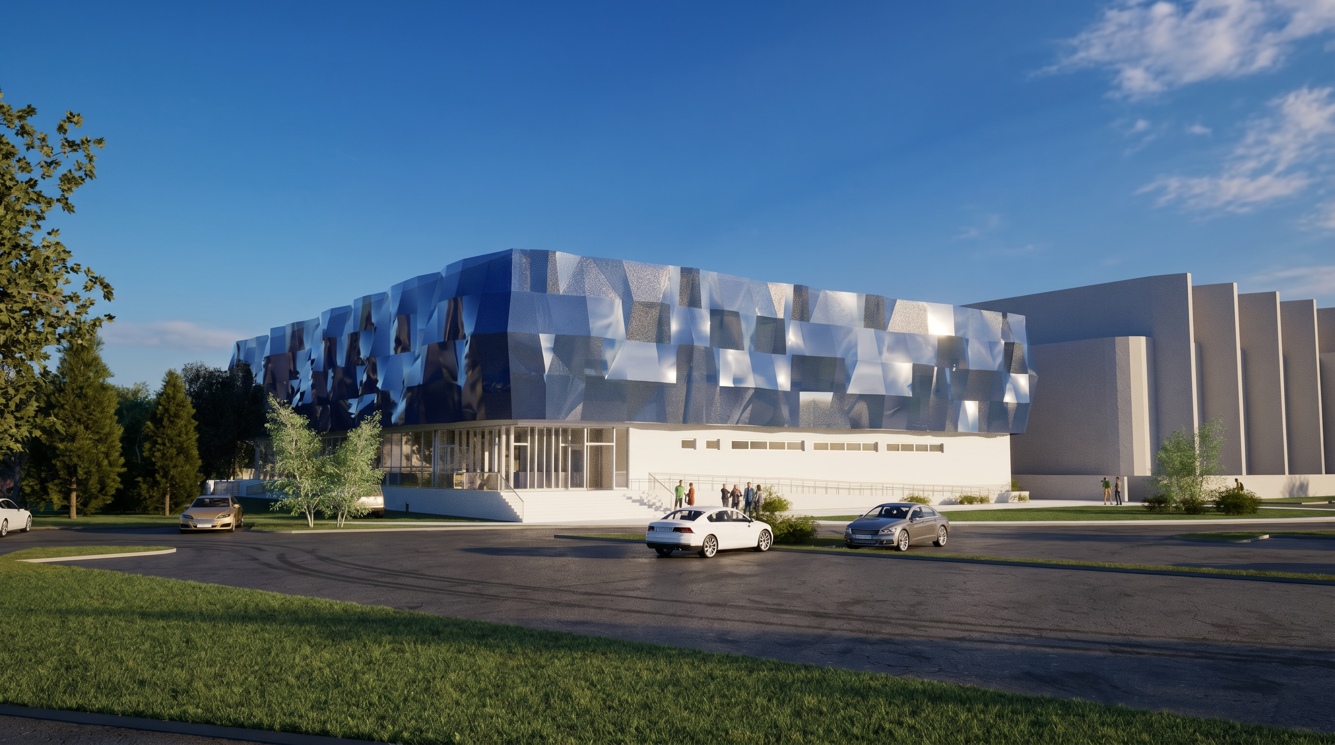 tadao ando exterior shot modern architectural building with a unique faceted blue facade reflecting various shades of deep blue and indigo the structure stands prominently against a clear blue sky with a white base featuring expansive glass windows and doors the surrounding landscape is lush with vibrant green grass and a variety of trees maintaining rich greens cars in the foreground add a sense of realism painted in neutral tones like silver white and metallic the atmosphere is bright and sunny conveying a clear serene day enhancing the modern aesthetic and dynamic lines of the architecture architecture