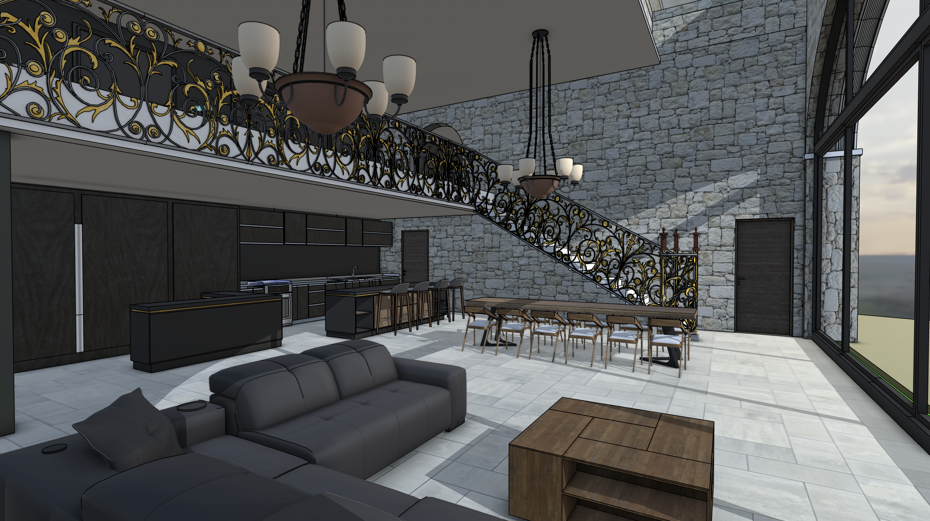 render a modern architectural scene of a rectangular stone building with large arched glass windows the walls feature light gray stone and are adorned with vibrant purple bougainvillea vines the foreground showcases a reflective water feature with a clear glassy surface while the surrounding garden has lush green grass muted yellow and purple flowers and tall dark green trees the sky is a bright azure with soft white clouds the atmosphere is serene and elegant blending nature with modern design