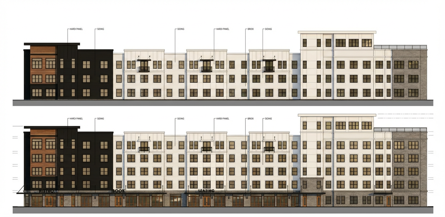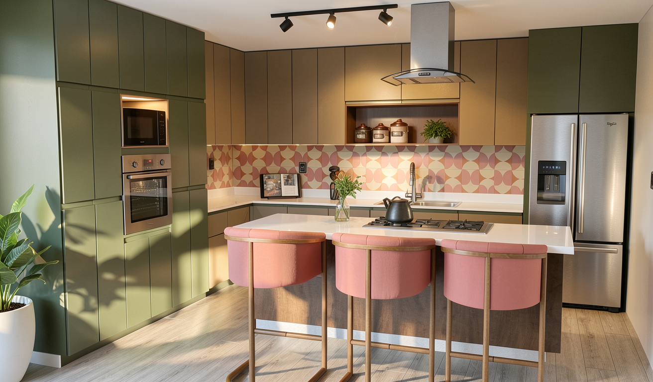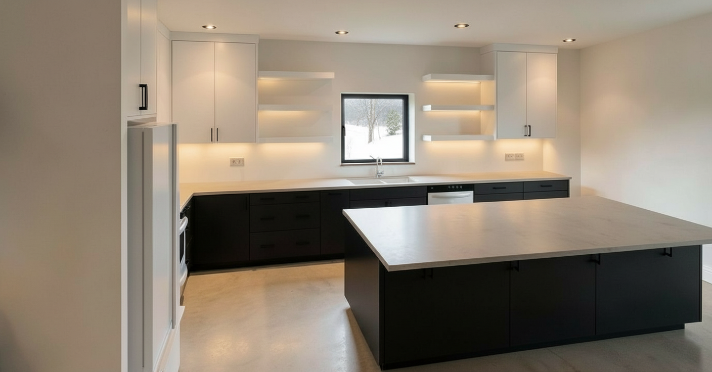 render a modern elegant kitchen interior the upper cabinets and walls should be a crisp white complemented by charcoal black lower cabinets and island include black handles on all cabinets the countertops are a sleek smooth concrete creating a clean and minimal look install warm soft puck lighting to create a cozy atmosphere casting gentle shadows that enhance the depth the floor is a light finished concrete adding warmth and contrast a window with a black frame provides a view of open countryside adding a touch of nature to the space create an inviting serene atmosphere with a balance of modern design and natural elements