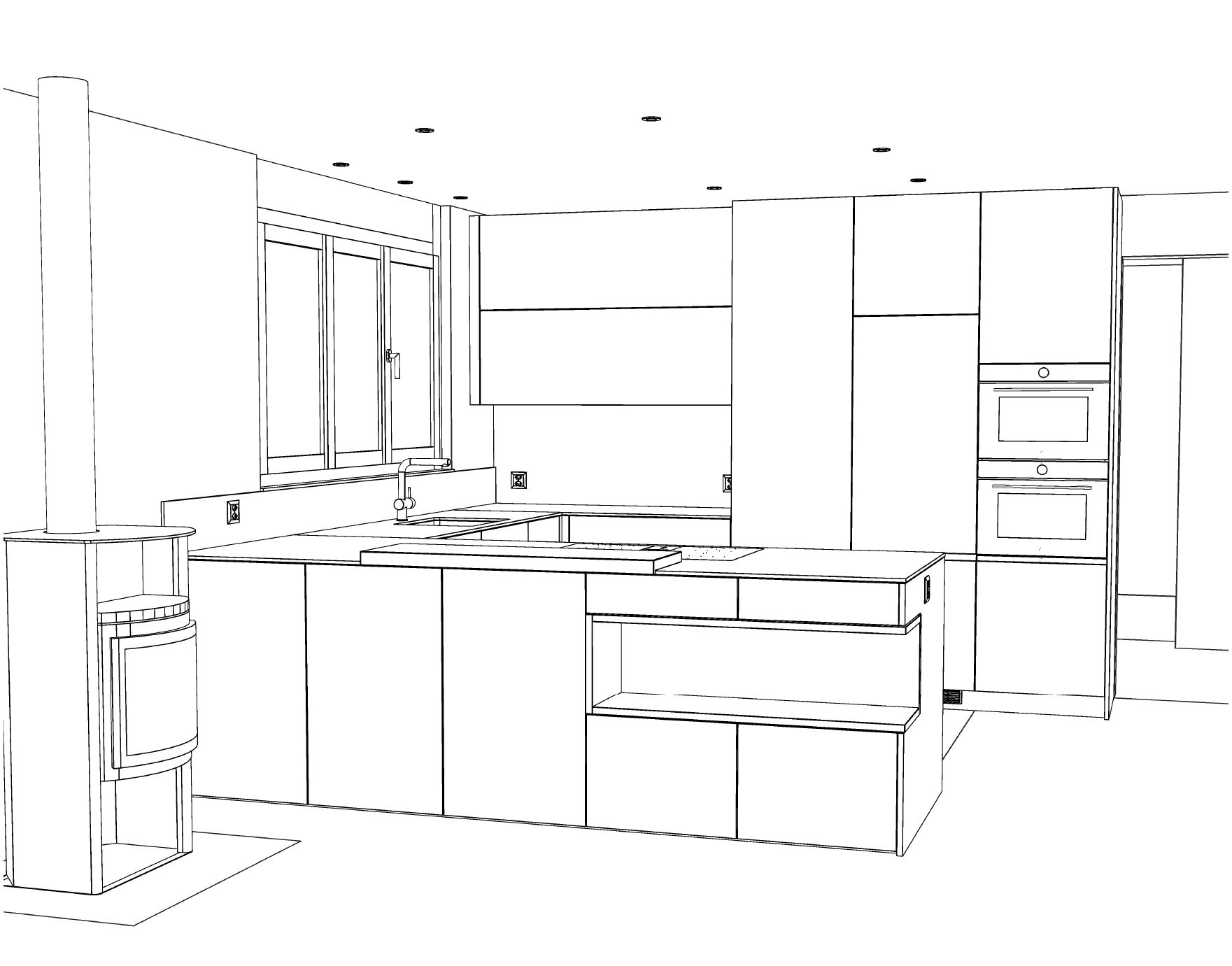 exterior shot do not improve functionality do not resolve construction logic do not add elements for ergonomic plausibility the rendering must reflect exactly what is drawn even if it appears incomplete den parkettboden um 90 grad drehen plattenboden nur beim kamin und die kleine ecke in der k che ansonsten l uft der parkett durch