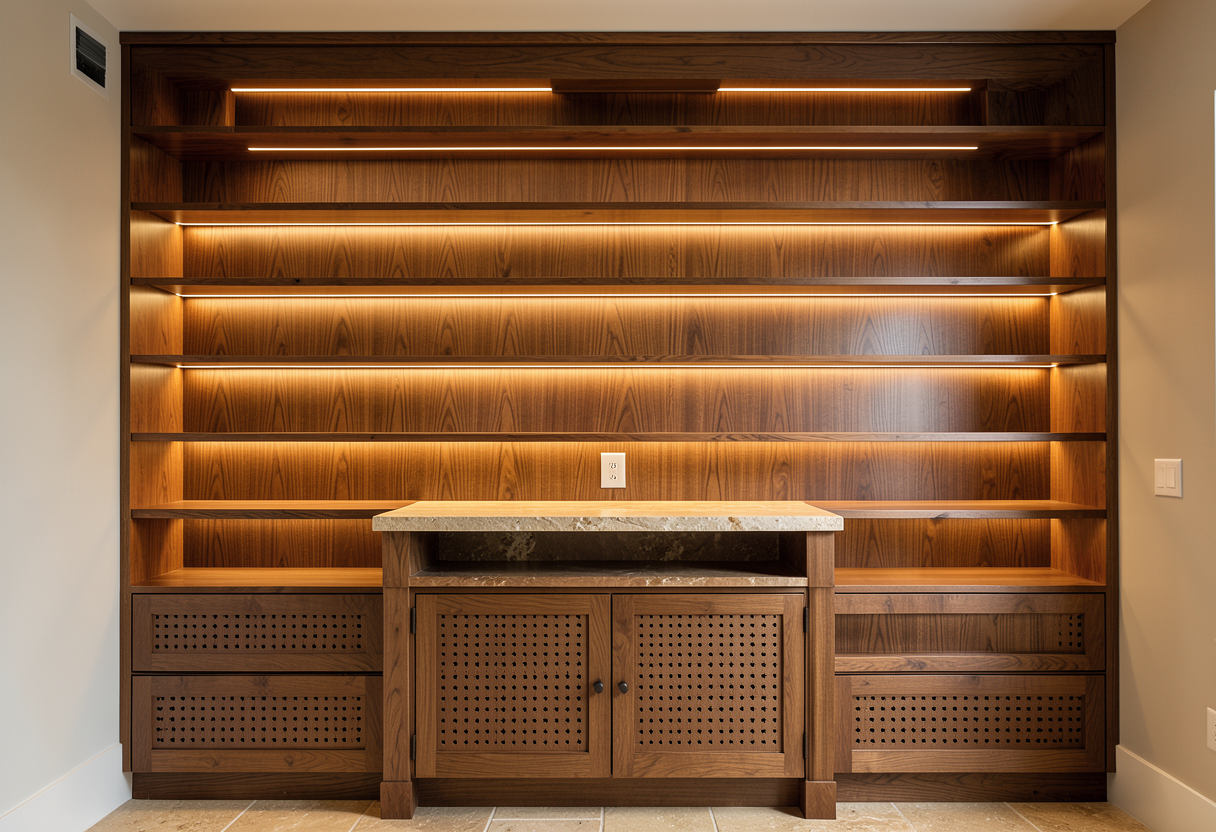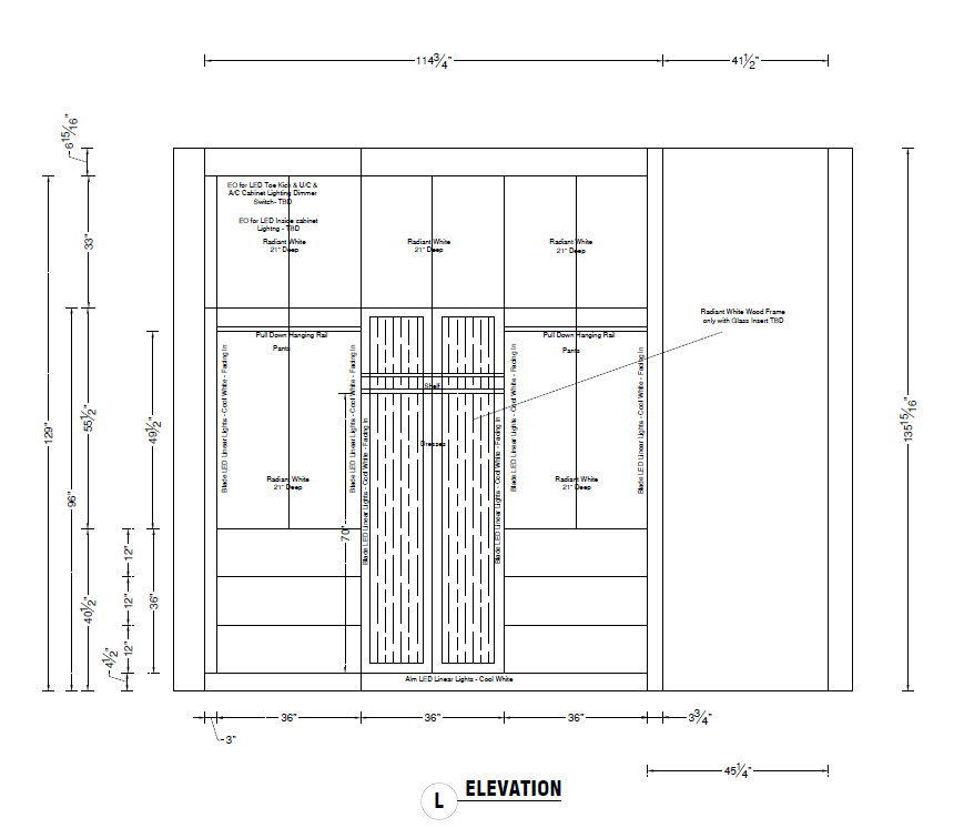 this elevation drawing provides a technical blueprint for a custom radiant white storage system likely for a high end walk in closet or dressing room key dimensions overall width approximately about total height just over sectional layout three wide main modules plus a wide end unit features and hardware storage specialized includes pull down hanging rails for pants a dedicated belt rack and a tall section for long dresses integrated lighting features built in blade led linear lights cool white in the vertical partitions along with toe kick and internal cabinet lighting materials specified in a radiant white finish with a standard depth of the far right section is a wood frame designed for a glass insert electrical notes power access designated locations for cabinet lighting dimmers and switches eo electrical outlets lighting type cool white led strips are integrated throughout for visibility and aesthetics