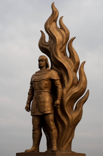 bauhaus exterior shot plastic statue minimalist design in red and blue colors architecture