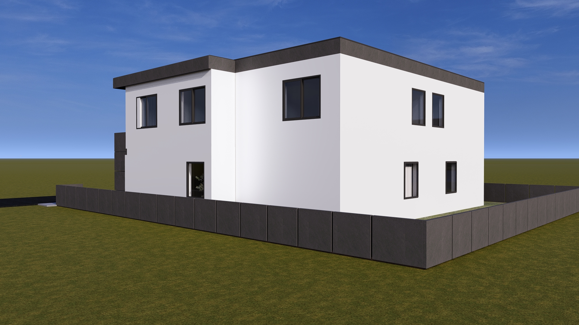 modern duplex house exterior in a real residential neighborhood natural daytime lighting photorealistic rendering realistic proportions and scale existing materials unchanged clean modern architectural lines subtle detailing high quality textures natural shadows real world camera perspective slightly landscaped surroundings ultra realistic architectural visualization style