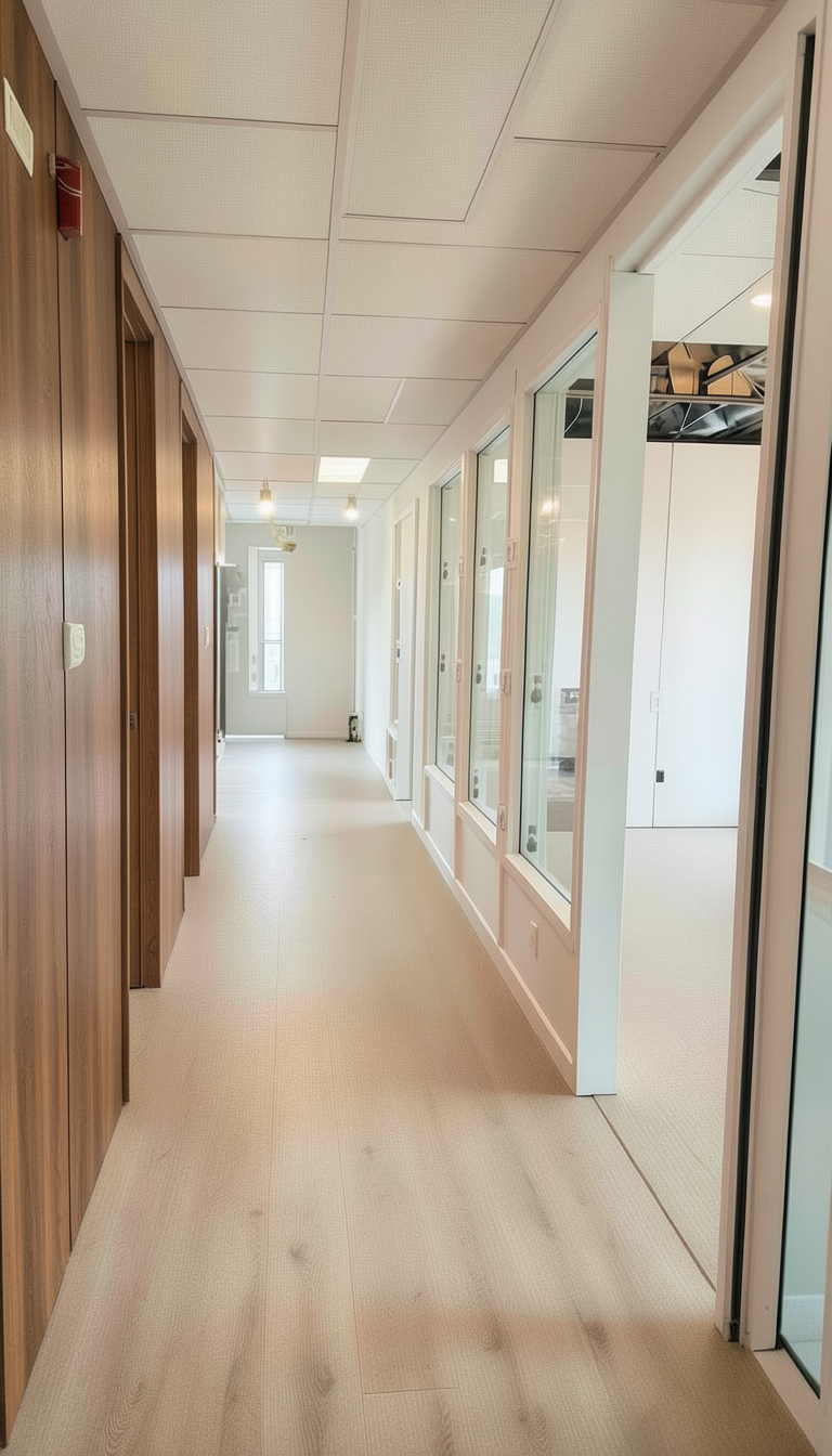 add wall cladding in walnut color inside the first room but keep the hallway as it is