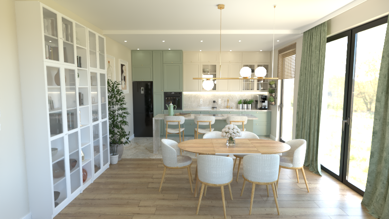 enhance realism and image quality while keeping all materials exactly the same do not change floor color tone texture or plank variation do not modify wood flooring in any way keep original lighting direction and brightness improve material detail only through micro texture refinement and subtle light accuracy natural warm daylight approx 4500k from the right side windows balanced exposure soft highlight roll off add subtle ambient occlusion in corners and under furniture increase realism of glass cabinet reflections soft natural brushed brass satin finish no chrome shine stone backsplash depth very subtle mineral variation remove cgi sharp edges and artificial contrast keep floor layout proportions and overall brightness unchanged professional architectural interior photography style no hdr no darker mood no color shift do not alter flooring do not darken flooring do not recolor flooring do not change wood tone