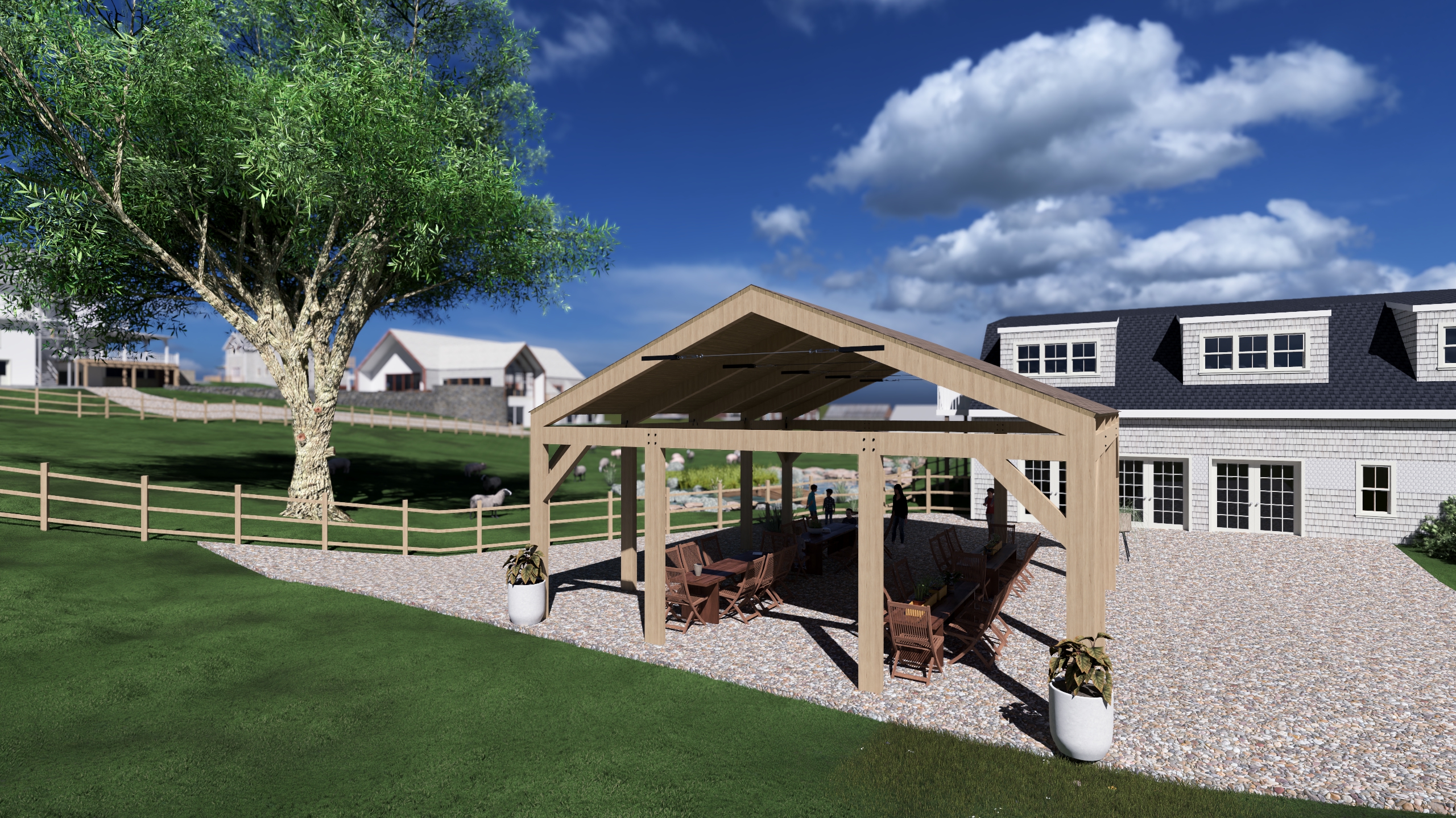 prairie style exterior shot render this scene with the location being block island ri with summer foliage and landscaping and people using the pavilion make the wood appear as weathered southern pine wood and highlight the black hardware and stainless steel cable tension ties architecture