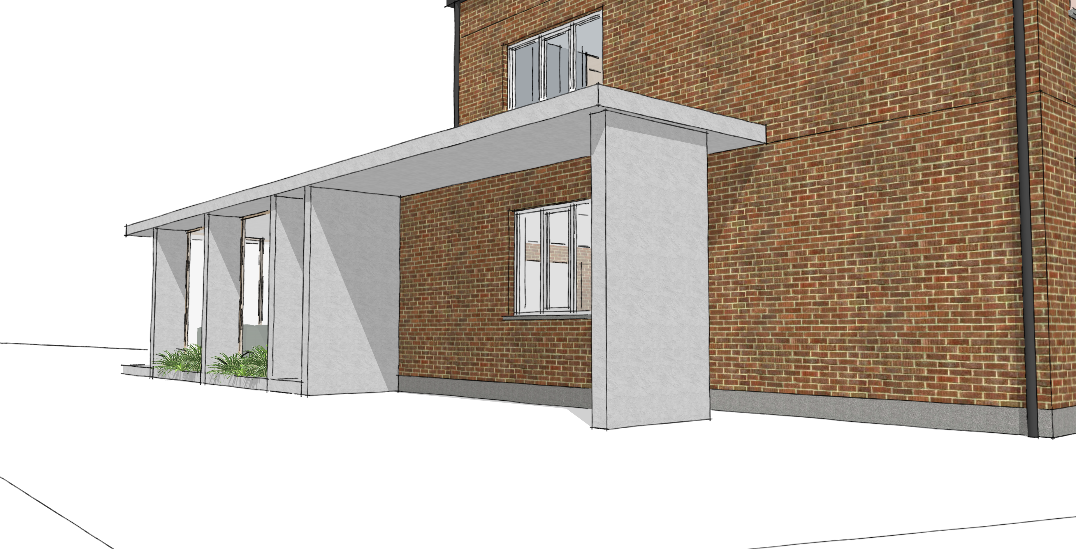 exterior shot house made out of traditional machined bricks the extention is concrete the windows have with frames next to the concrete extention on the left there is a driveway