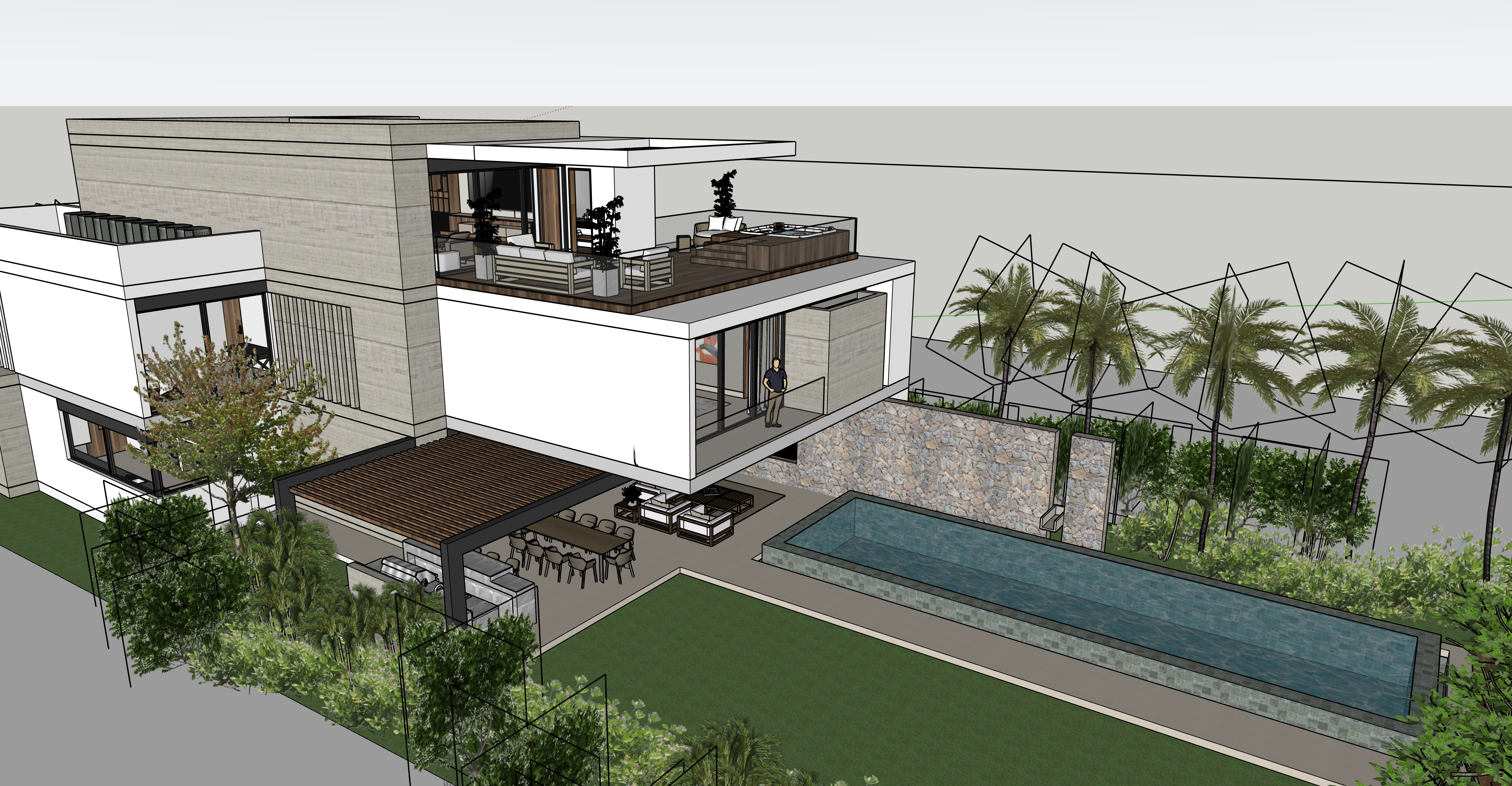 large residential building with exterior lighting roof top lighting for jacuzzi area terrace and pool and garden material same as presented in the photo