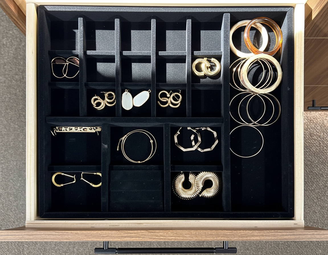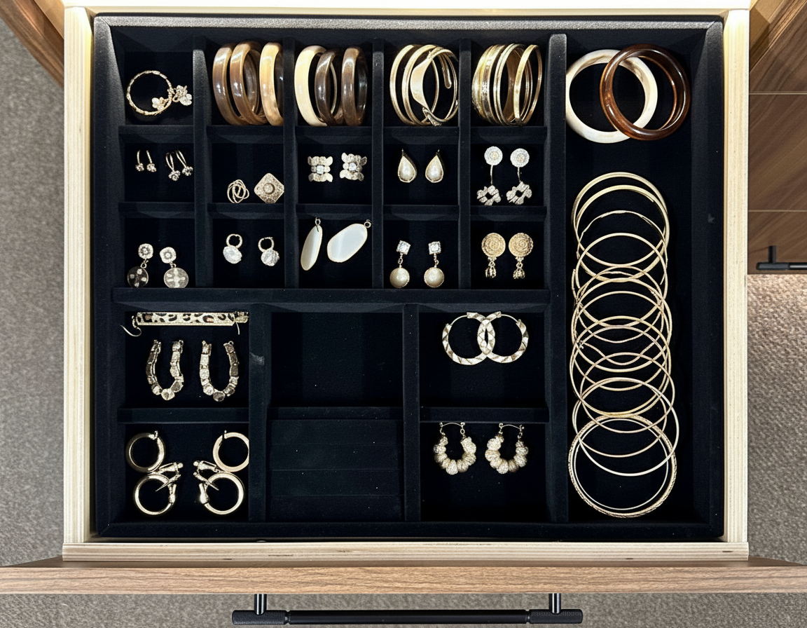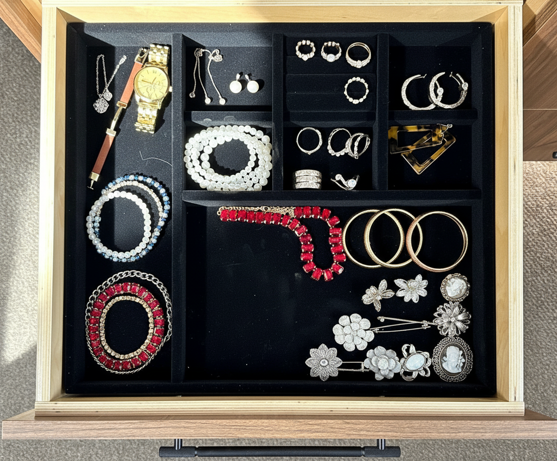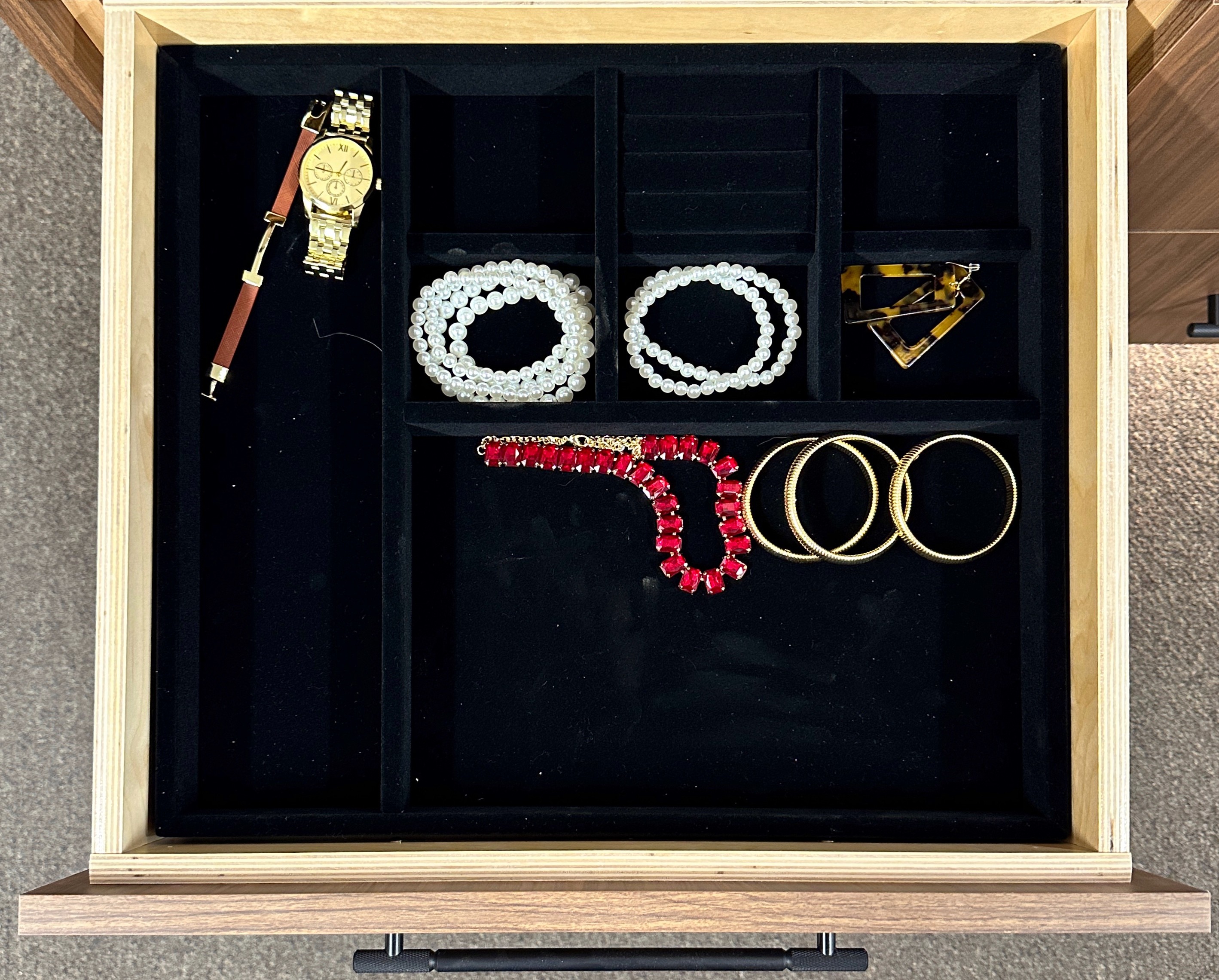 make the lighting natural add more jewelry to the cubbies organize the jewelry that is already in the drawer