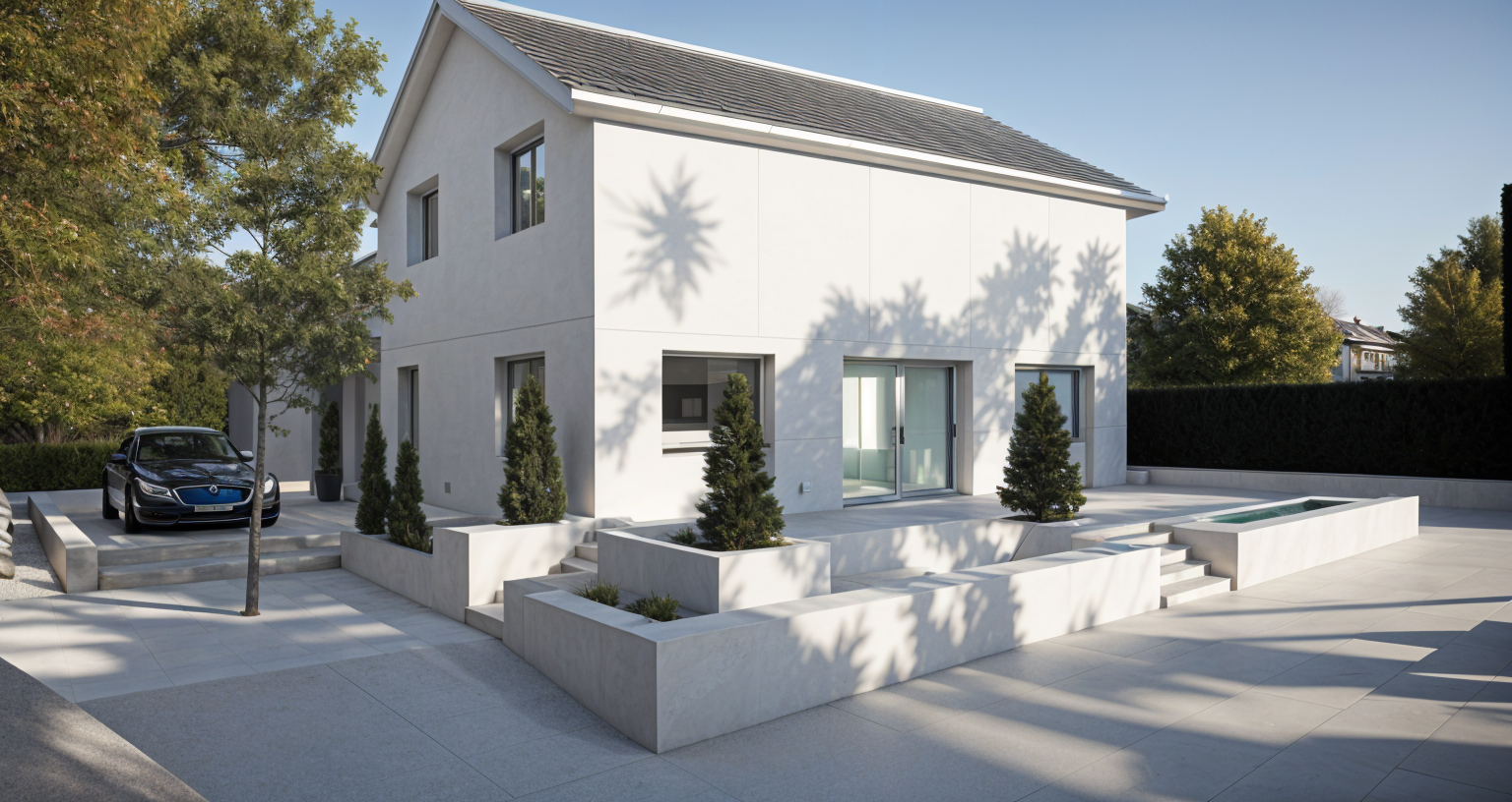 add trees with a dramatic colors keep the main elements as it is architecture