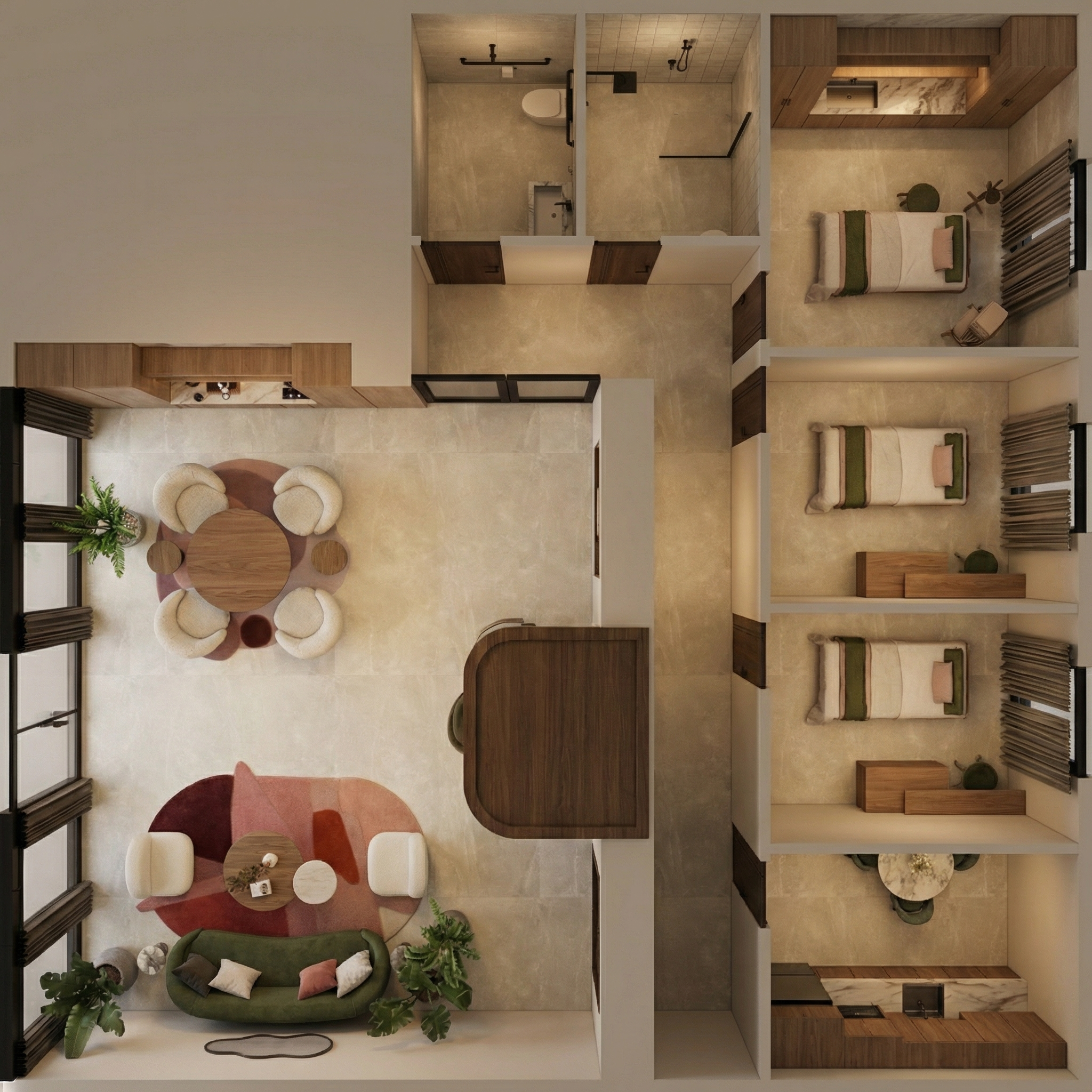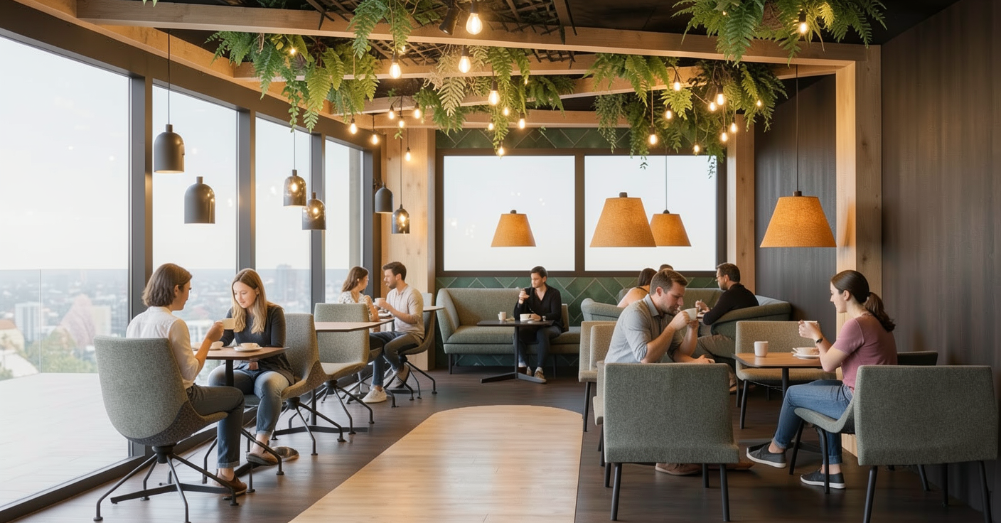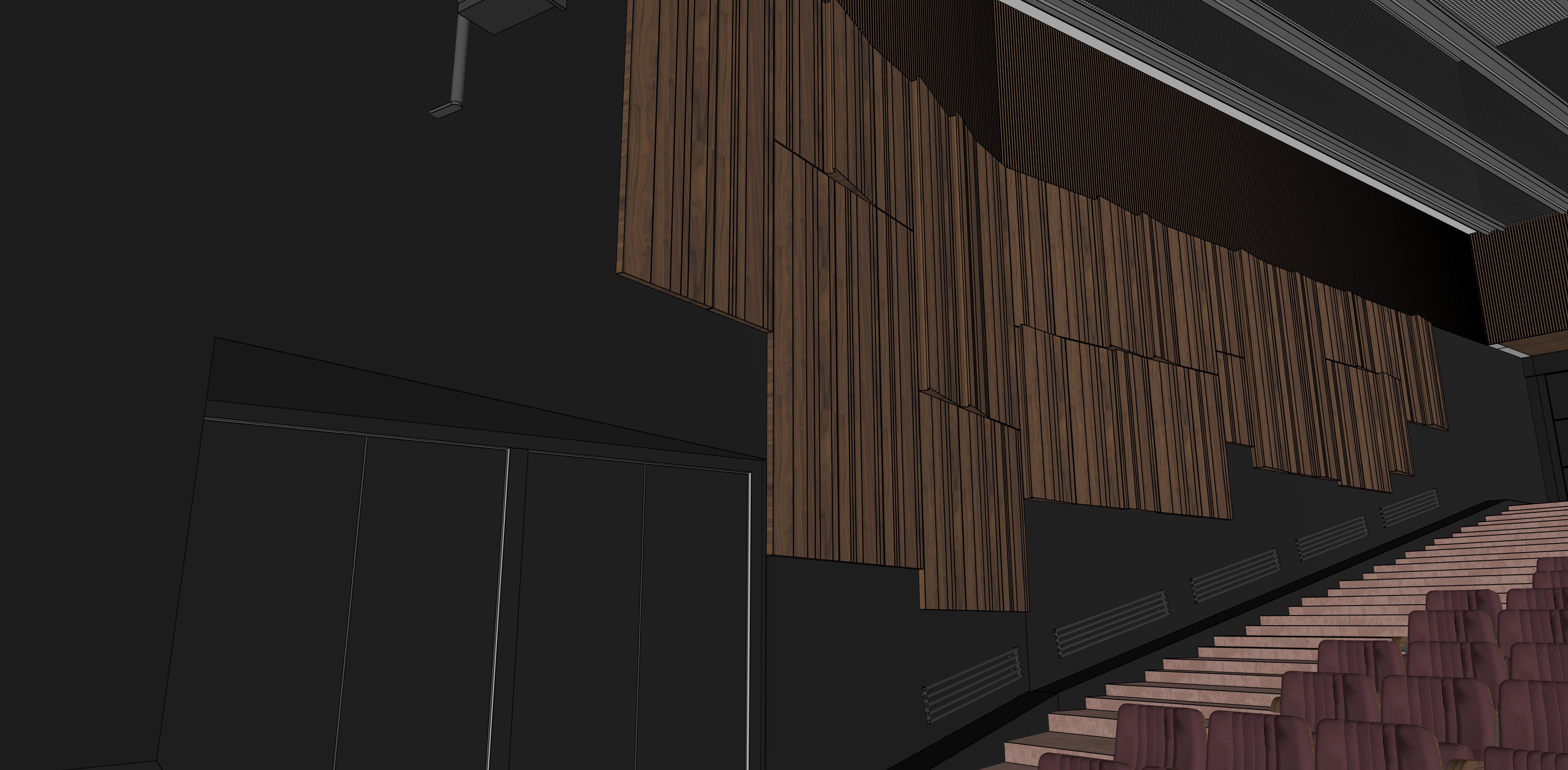 transform the provided theatre interior image into a high end photorealistic render with warm atmosphere soft glowing highlights and relaxed upscale coastal energy while keeping everything exactly the same same proportions same materials and same spatial configuration do not move or alter any objects geometry textures colors or furniture positions the chairs materials should read realistically the black wall is from acustic panels from reciclated materials carpet on the floor wooden panels with carved lines a led light is hidden vertically in the slanted panels top strip made of thin wooden slats