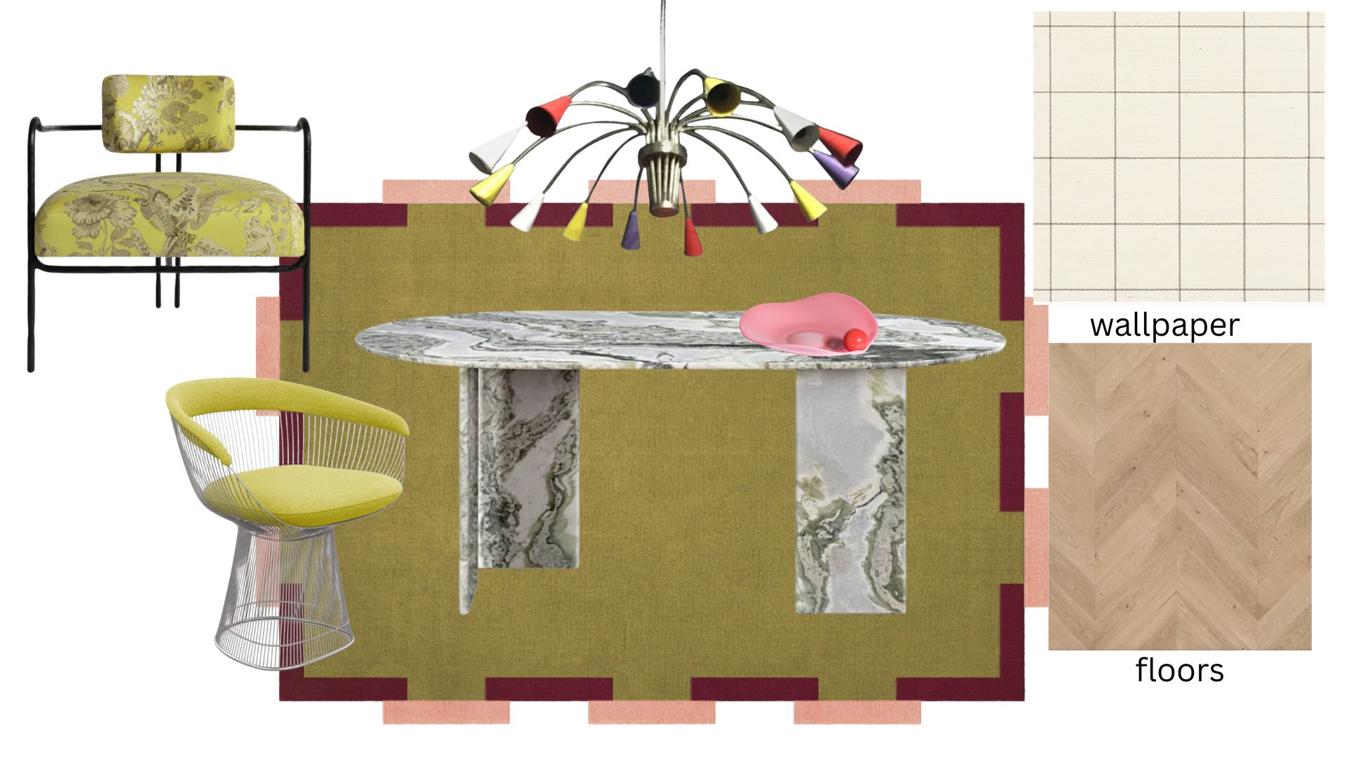 create a dining room for 6 people add wallpaper and floors indicated in the moodboard