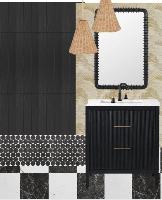 render a stylish modern bathroom with a luxurious atmosphere feature a black vanity with gold handles and a marble countertop the shower walls are adorned with sleek black vertical tiles complemented by elegant gold palm leaf patterned wallpaper include round black and white mosaic tiles as shower floor the floor is a classic black and white marble checkerboard pattern incorporate two rattan pendant lights above the vanity and a large black framed mirror reflecting warm soft lighting to enhance the cozy elegance of the setting