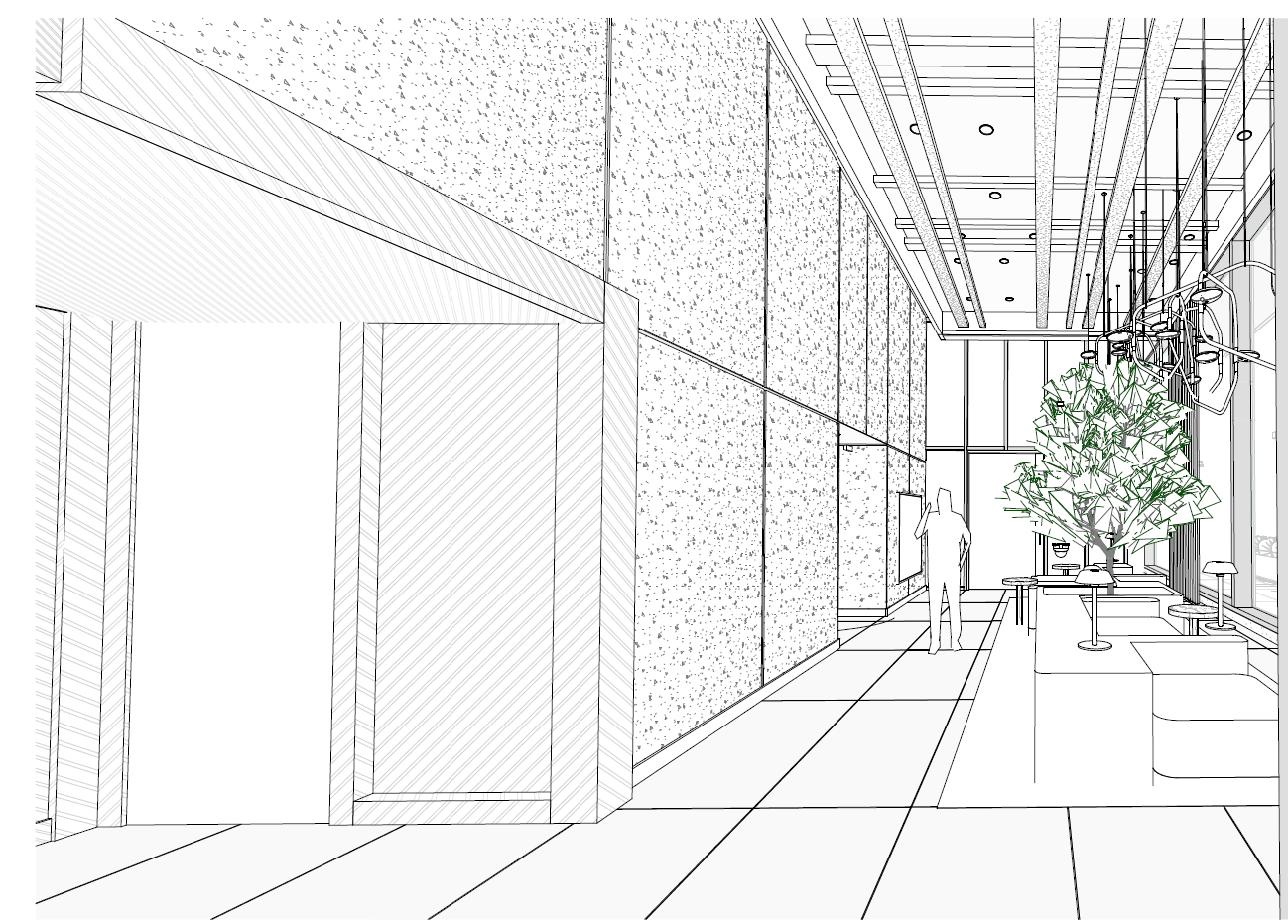 exterior shot wall are in traventine floors are in salt pepper granite with stainless steel insert at the conceirge nook urban space while retaining heritage value of traventine and granite floors