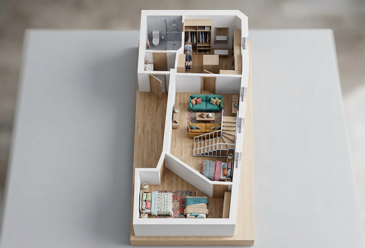 convert this floor plan into a realistic isometric 3d view of a full house show the space from an elevated angle with furniture walls and details visible pavimenta l esterno con la pietra i pavimenti interni sono in parquet di rovere opaco a spina francese usa colori molto tenui per l arredo e non usare stoffe colorate attieniti alla disposizione di progetto use the same furniture as shows on the plan do not change the orientation of the floorplan