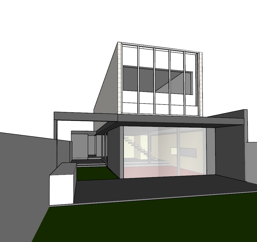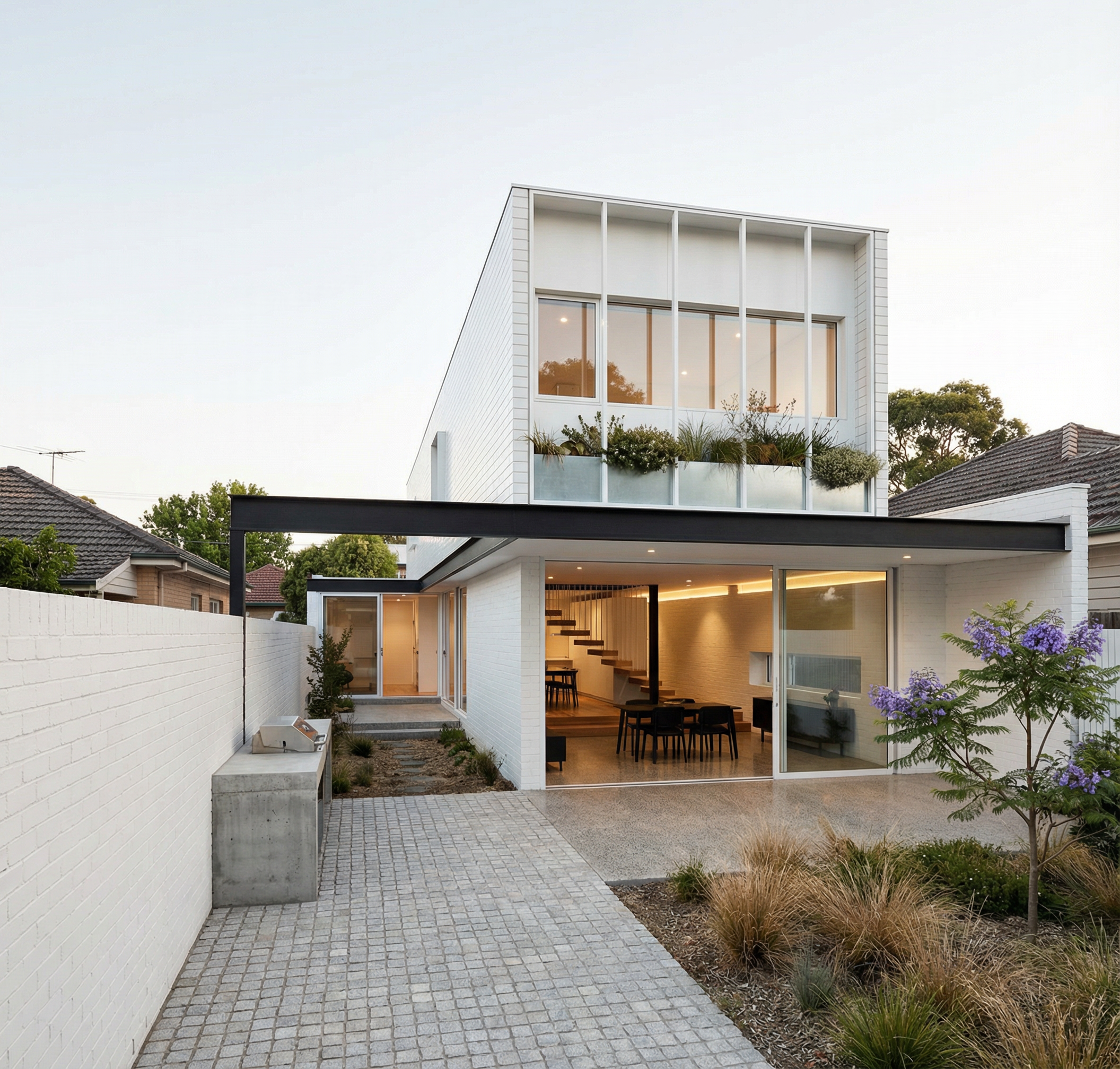 important do not change or modify the base geometry in any way overall style scandinavian realistic and calm neutral tones natural materials matte finishes soft lighting residential architectural photography mood exterior ground and landscape exterior paving light gray small format cobblestones with subtle texture and natural variation dry garden areas with ornamental grasses simple and natural composition add a small jacaranda tree integrated casually within the dry garden foreground left side the existing block should be rendered as a cast in place concrete barbecue bbq solid and minimal exposed concrete finish architecture and materials ground floor walls white brick masonry matte finish visible brick texture interior visible through windows ground floor flooring polished concrete light gray tone with visible polished stone aggregate and vitrified finish from the stair steps upward wood flooring visible interior furniture made of dark wood ebony tone scandinavian style structural element a visible black metal c beam between the upper and lower volumes matte black finish open side facing outward upper volume side fa ades white small format ceramic cladding clean layout with subtle joints upper volume front fa ade white finish with white metal framing a continuous metal planter running across the full width below the window natural plants growing organically from the planter not too dense lighting and context interior lighting soft warm artificial light coming from the windows subtle and indirect background behind the boundary wall include neighboring house rooftops and trees to provide realistic urban context lighting conditions soft daylight combined with warm interior glow no harsh shadows camera eye level architectural perspective natural and balanced framing