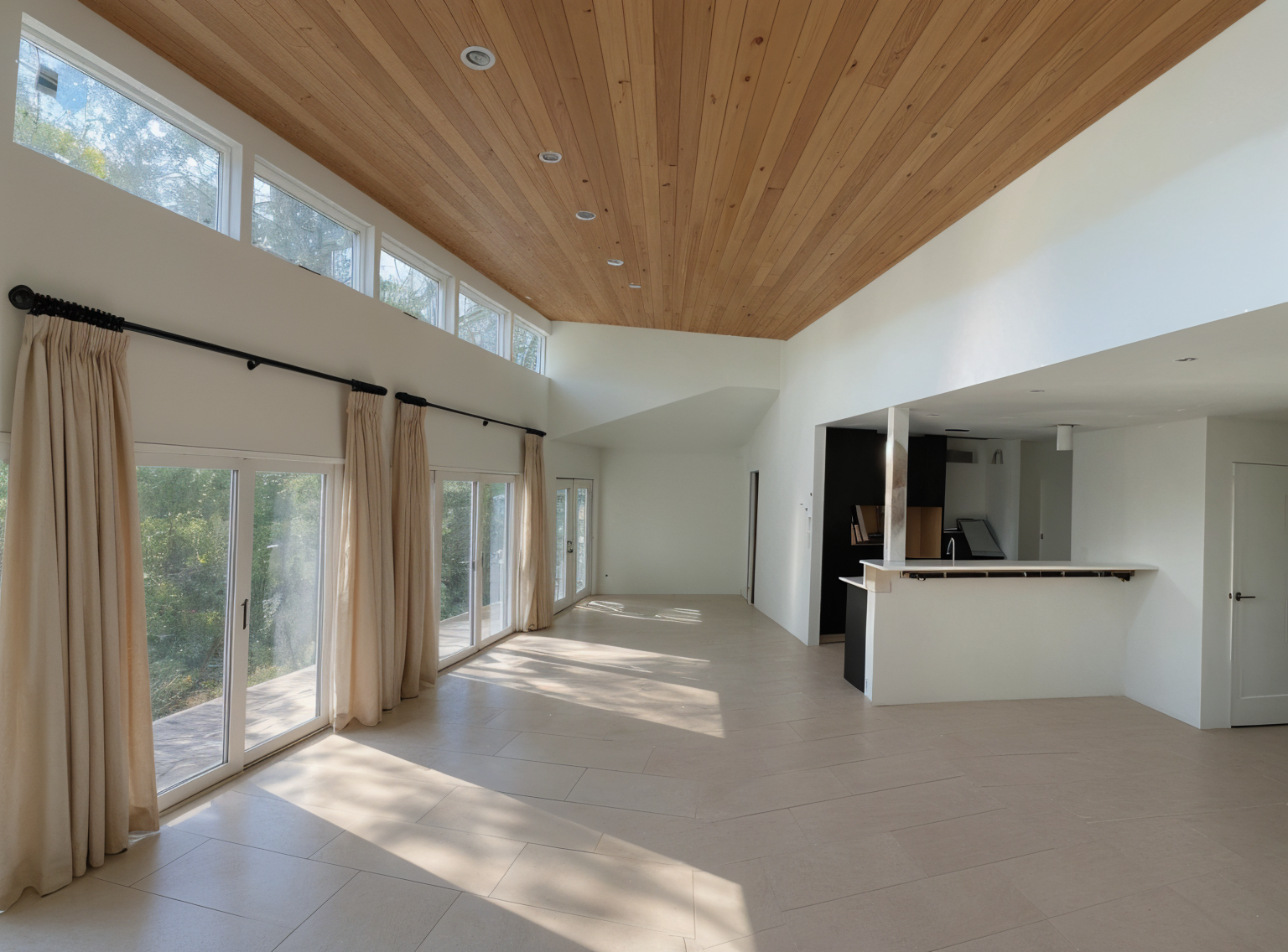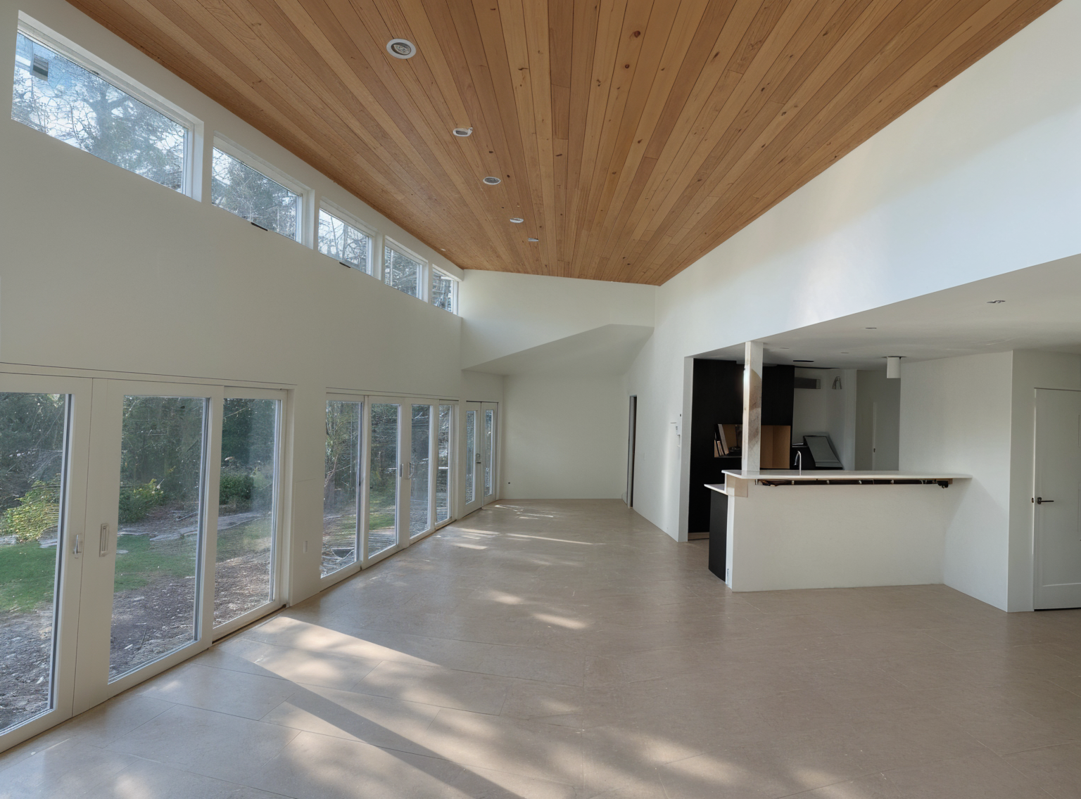 a manicured lawn layered flower beds low maintenance shrubs native plants stone pathway leading to the entrance sun late afternoon and some clouds